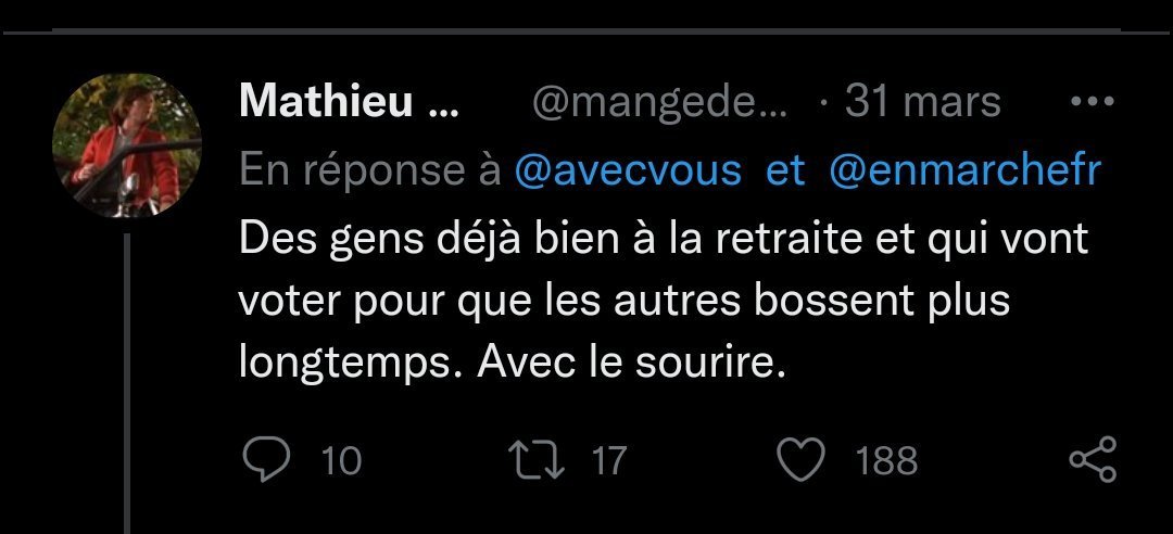 Le 01 avril 2022 à 18:00:22 :Suite au topic de JMChine_8, honteusement supprimé par la modération https://twitter.com/avecvous/status/1509480790777909250?t=F57BmIXPyaNI4Vexiz2hgw&s=19
