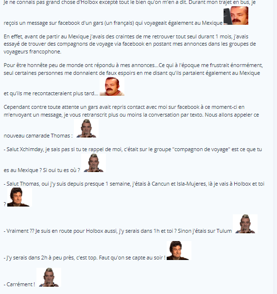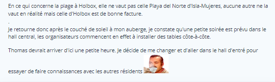 Il y avait pour être exact 3 français autour de moi, le reste étant de nationalité étrangère et éloigné de ma place. Je ne vais pas trop m'attarder sur ce groupe de français car ils ne seront en réalité pas important pour la suite du risitas mais si je devais vous les décrire brièvement je dirais qu'ils avaient tous entre 23 et 27 ans, deux d'entre eux étaient super beau gosse faut l'avouer, des Chad comme on les appelle sur le fofo et leurs principales but au Mexique c'était faire la fête et baiser des meufs