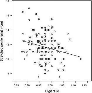 L'indice de Manning est à lire sur l'axe "Digit ratio", La valeur "1" signifie que l'index et l'annulaire sont de la même taille. Lorsqu'il est inférieur à "1", l'index est plus court que l'annulaire et inversement si l'indice est supérieur a "1". Pour rappel les hommes ont, en moyenne, un indice de Manning inférieur à 1. La courbe tracée met en évidence que plus l'indice de Manning est petit (c'est à dire plus l'index est petit par rapport à l'annulaire), plus le pénis est grand.