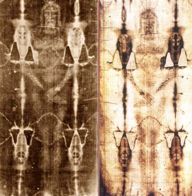 Pris en photo, le linceul révèle un négatif. Ce que vous voyez ici n’est pas ce que vous verrez en face du linceul. Imaginez la stupéfaction des gens qui devaient s’imaginer un vieux fake du moyen age