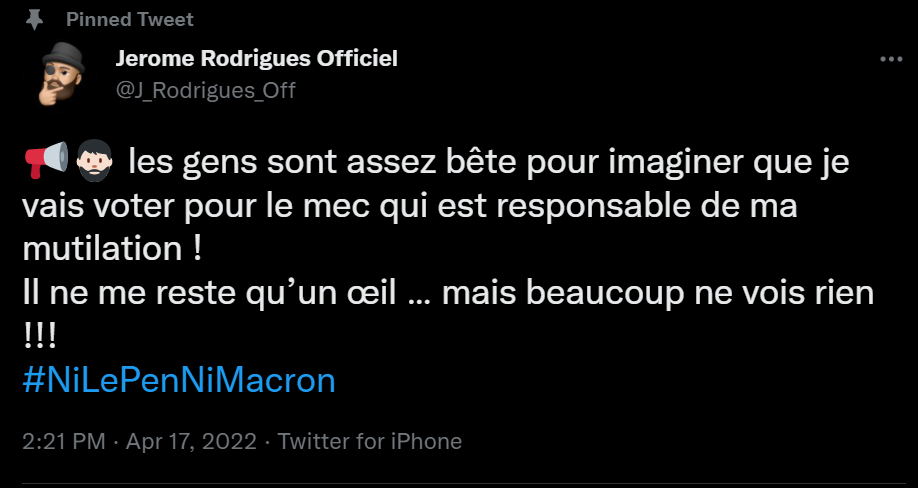 Cocasse pour quelqu'un qui a défilé tout le quinquennat au son de "macron démission" et s'étant fait mutilé.