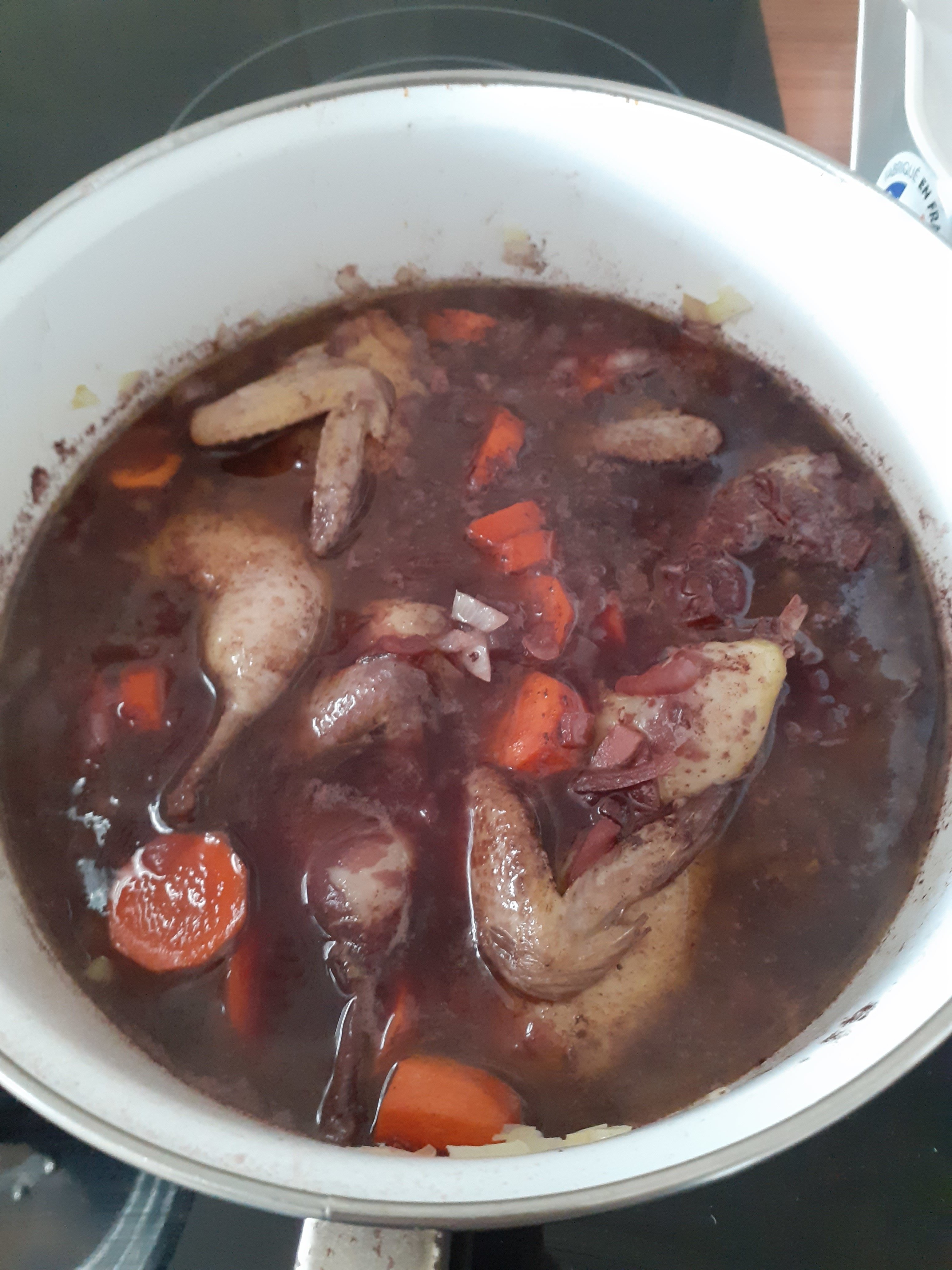 Une fois que c'est fais, j'ai noyé dans le vin rouge, au moins à hauteur. Tu rajoute carottes/ail. J'ai aussi mis 2 petit Kubor.