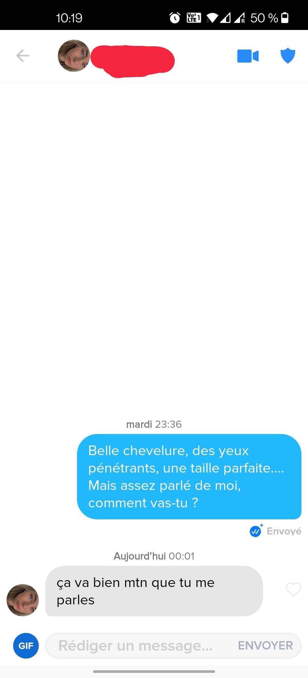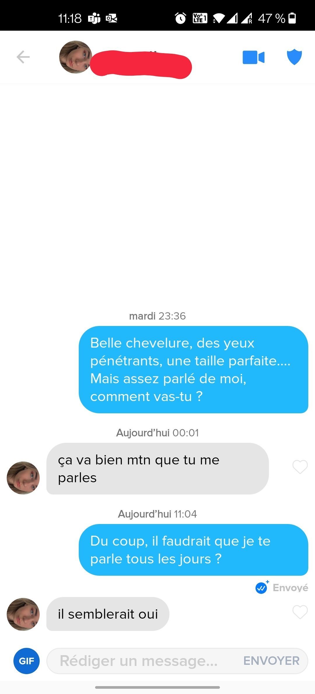 Elle se fatigue même pas à te demander en retour si tu vas bien, je prédis que tu vas devoir gérer 80% de la discussion !Réponds lui : "Du coup il faudrait que je te parle tous les jours ?"