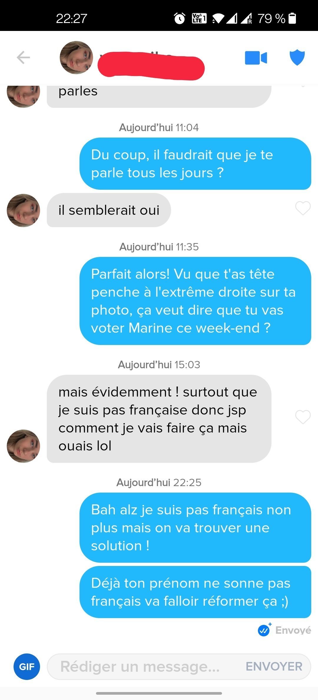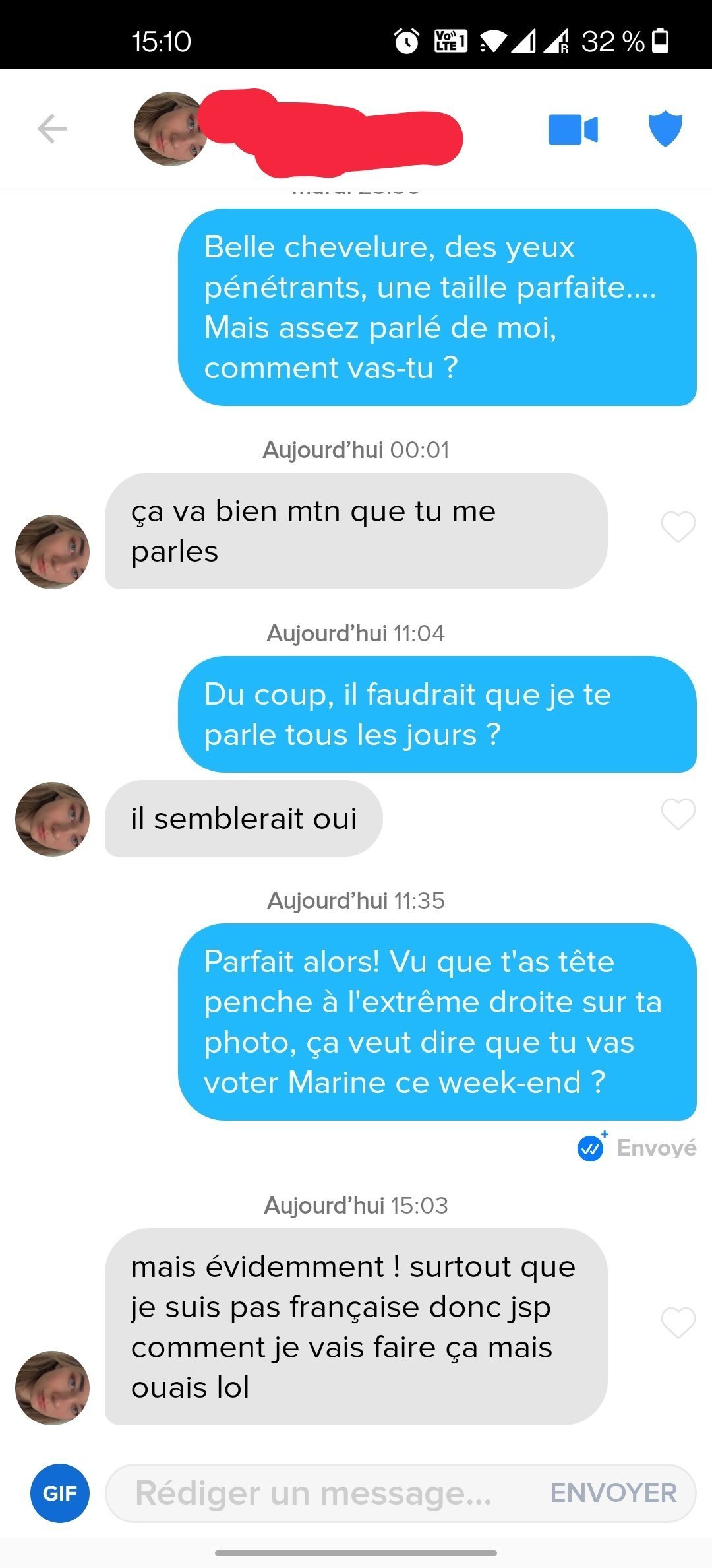 "Parfait alors! Vu que t'as tête penche à l'extrême droite sur ta photo, ça veut dire que tu vas voter Marine ce week-end ?"