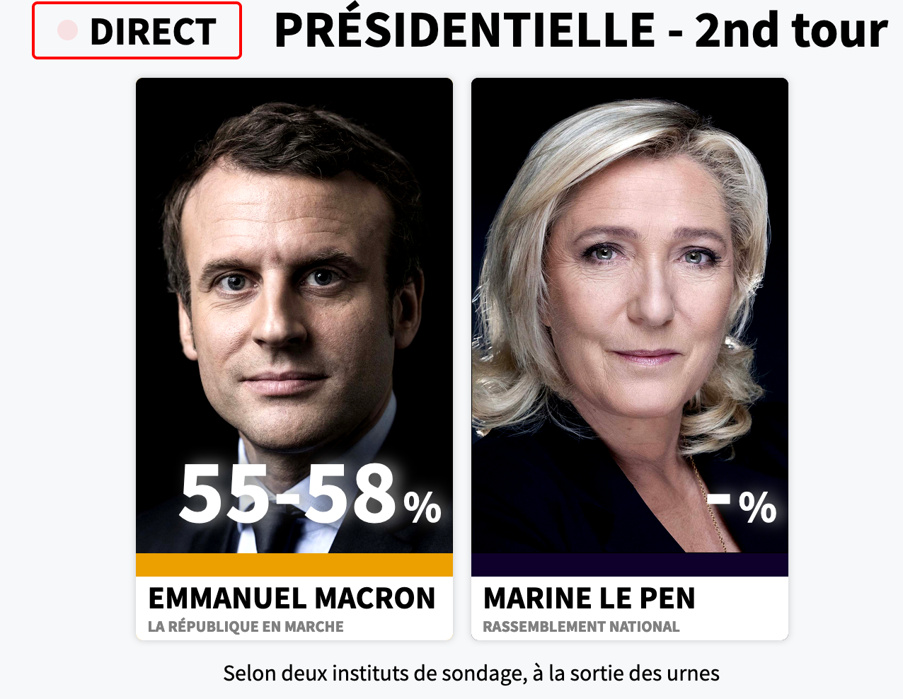 Les mêmes qui disaient 24% pour Macron à 18h au premier tour puis passent à 28% à 20h dès qu'ils apprennent les véritables estimations françaises d'après 19h et pas leur fake sondage "sortis des urnes" ?