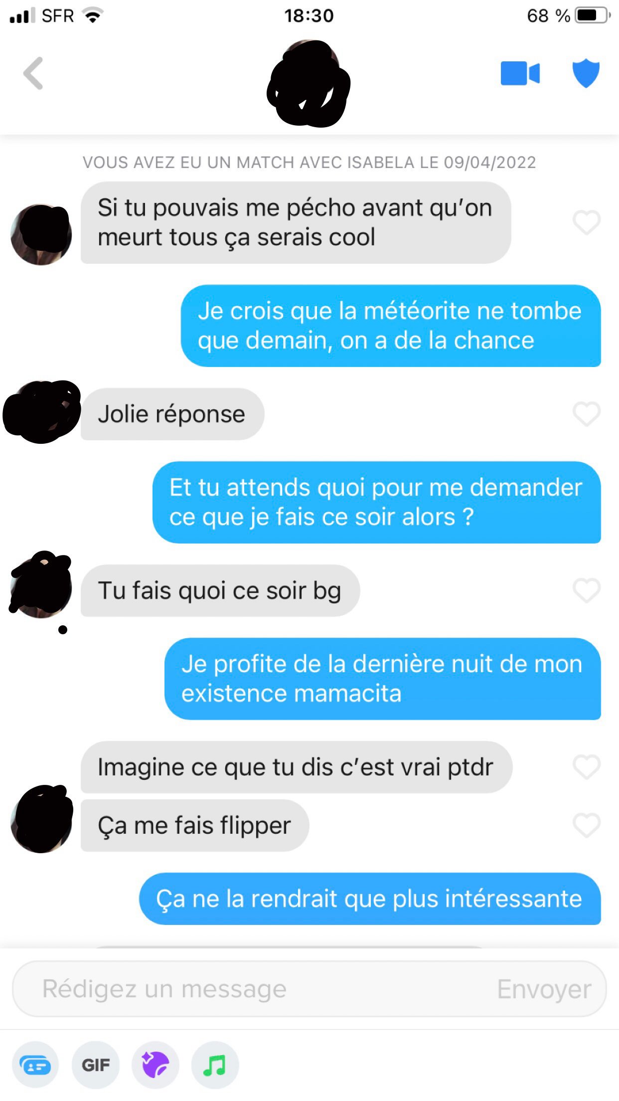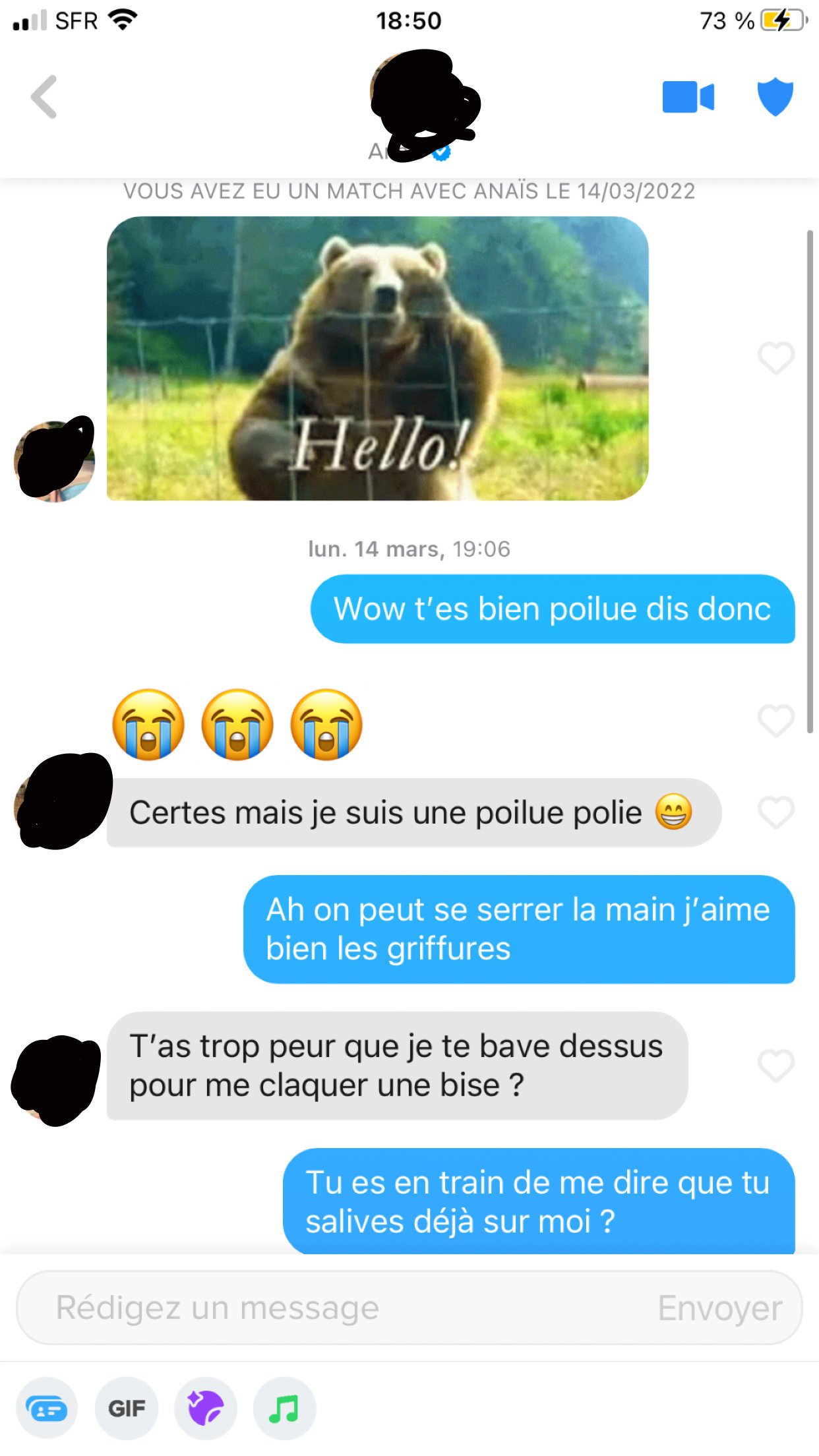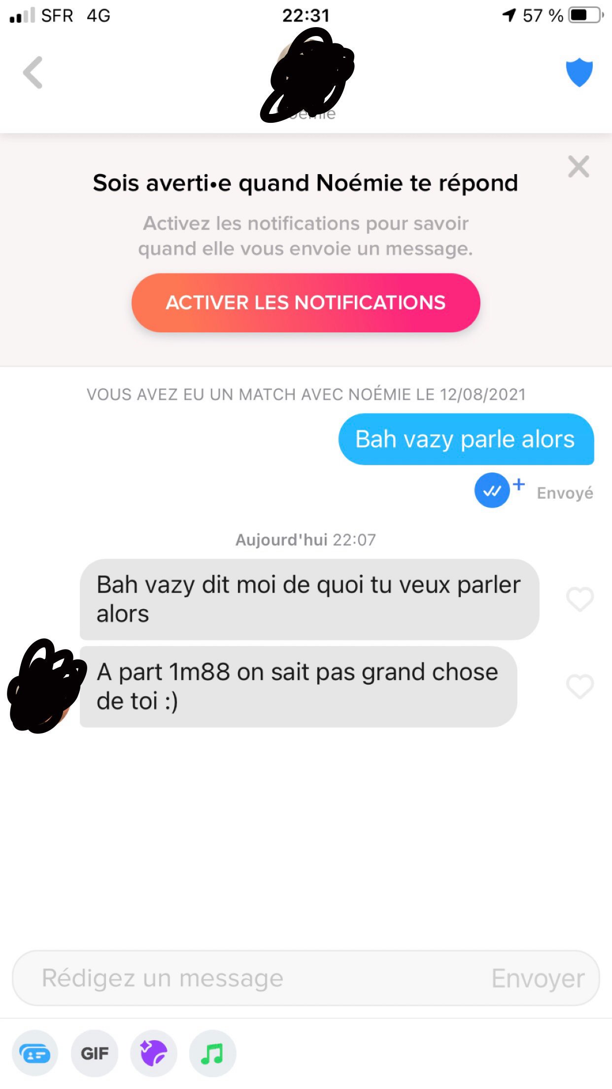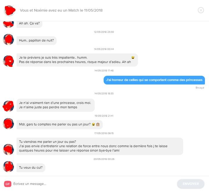 Salut , J'arrive à avoir quelques matchs , mais je suis incapable de commencer une conversation. Quelqu'un pourrait me montrer à quoi ressemble ces débuts de conv ? Ma requête peut paraître absurde , mais je suis pas très habitué à parler à des meufs