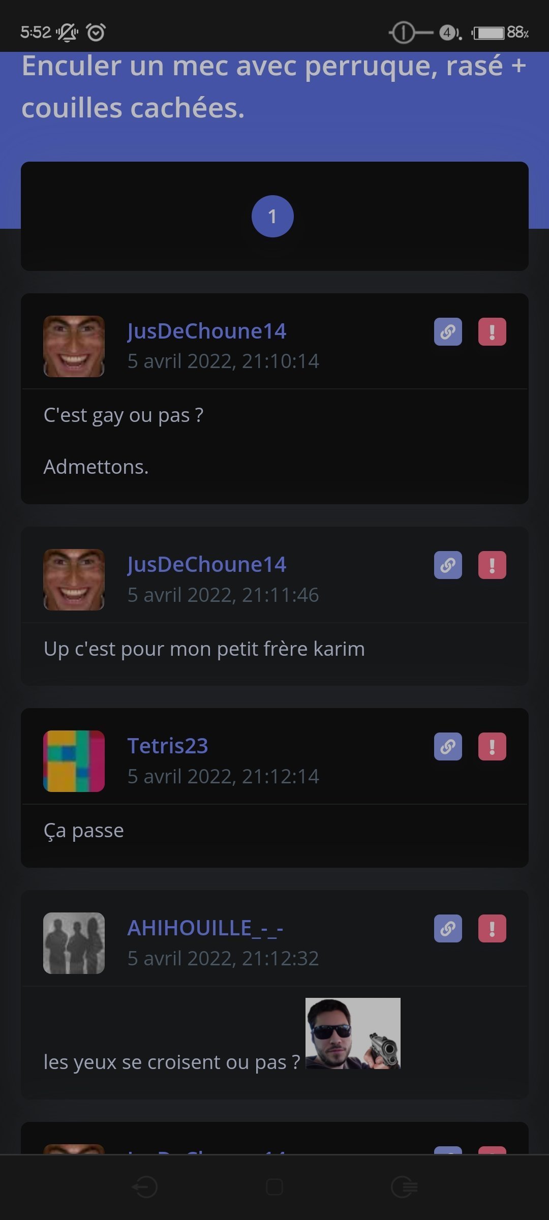 J'ai envie de gerber quand je repense aux messages, y en a même un elle dit ouais j'ai du bloquer un gars y avait trop de tension ont se cherchait sexuellement j'ai du le bloquer il finissait par me 'harceler'.![]()