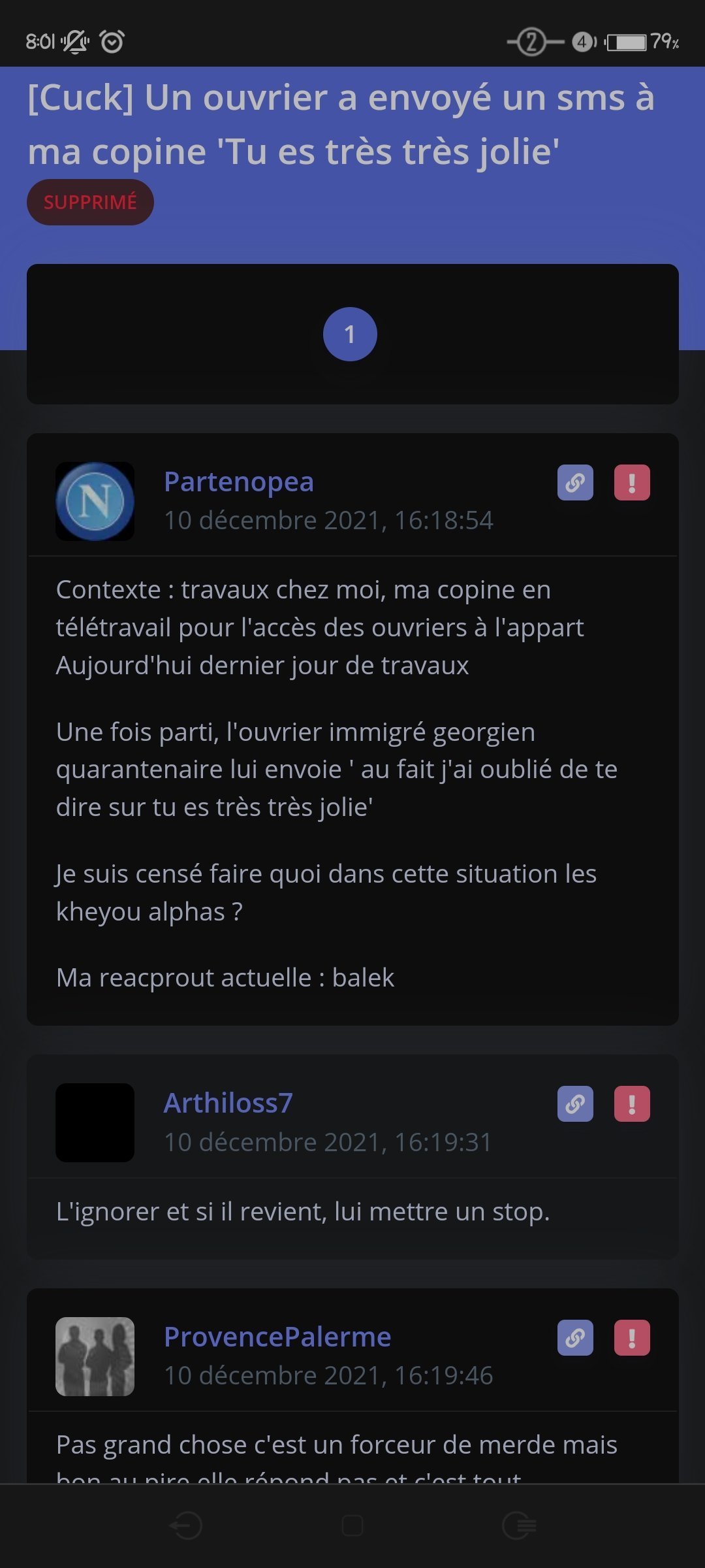 J'ai envie de gerber quand je repense aux messages, y en a même un elle dit ouais j'ai du bloquer un gars y avait trop de tension ont se cherchait sexuellement j'ai du le bloquer il finissait par me 'harceler'.![]()