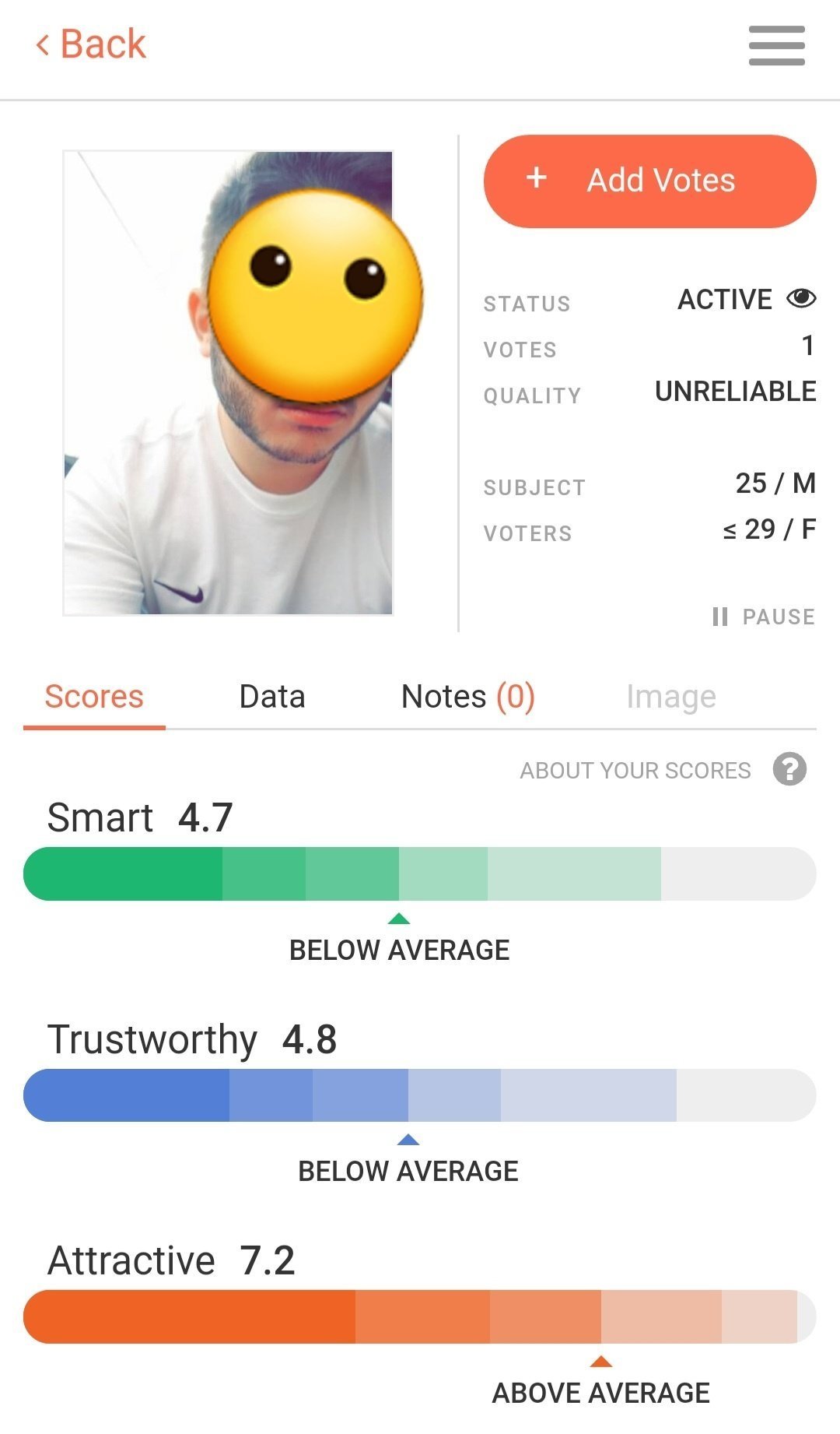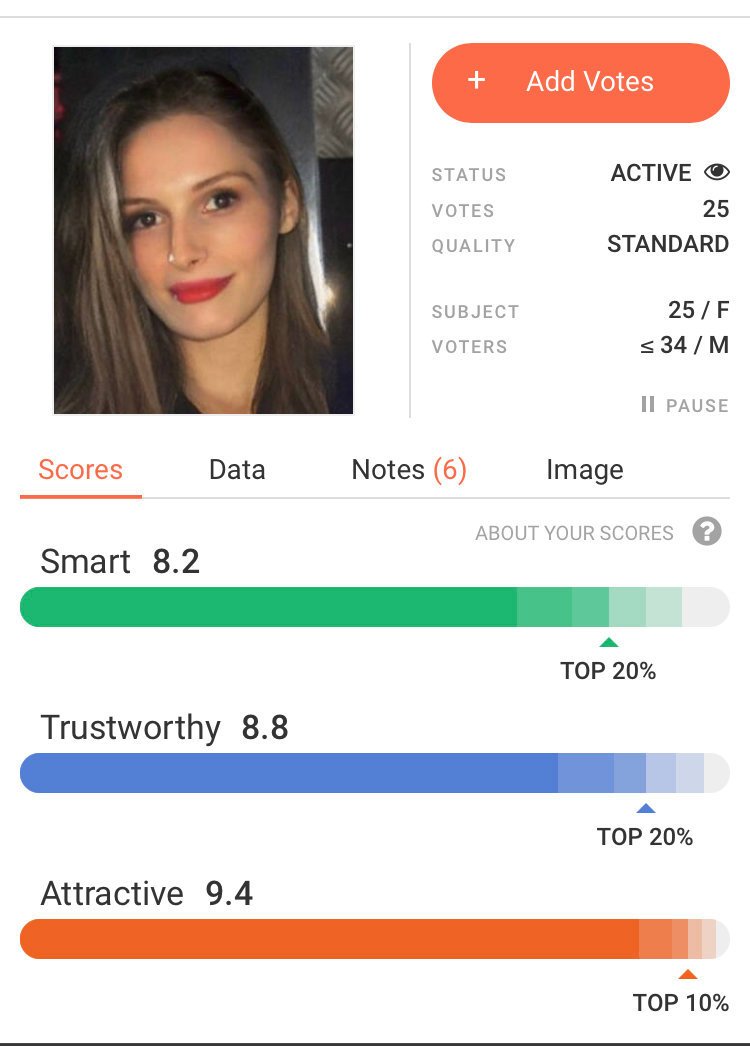 T'as 3 catégories Business, Social & Dating la en l'occurence c'est Dating, les notes sont différentes selon la catégorieC'est pas mal pour savoir si une photo en particulier peut fonctionner ou non sur Tinder et autre par exemple