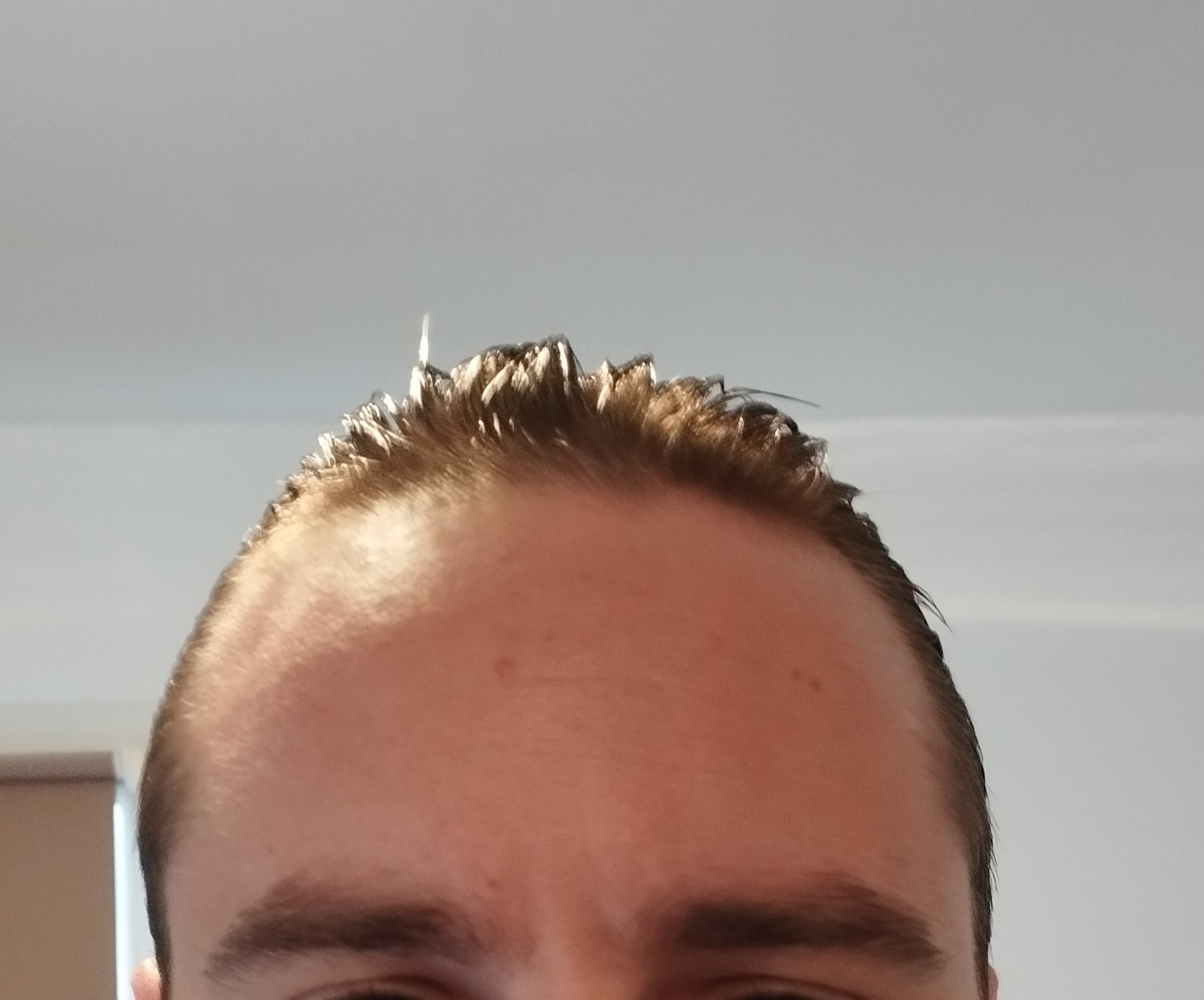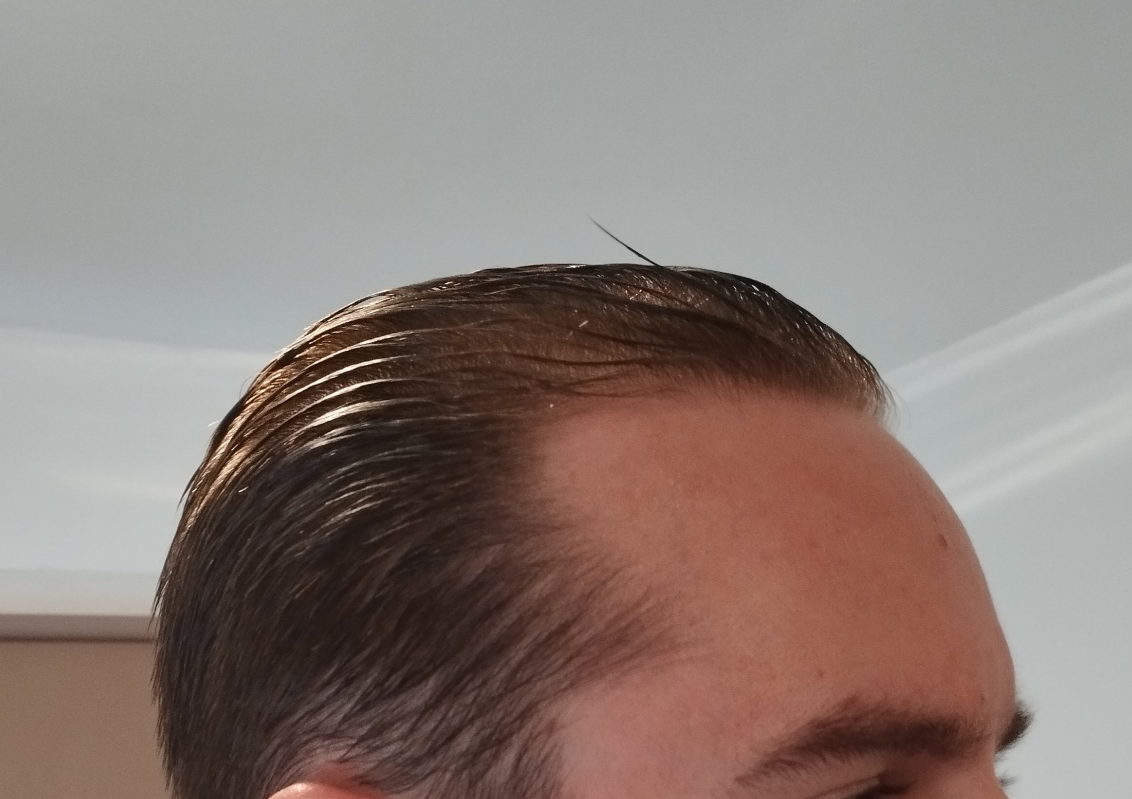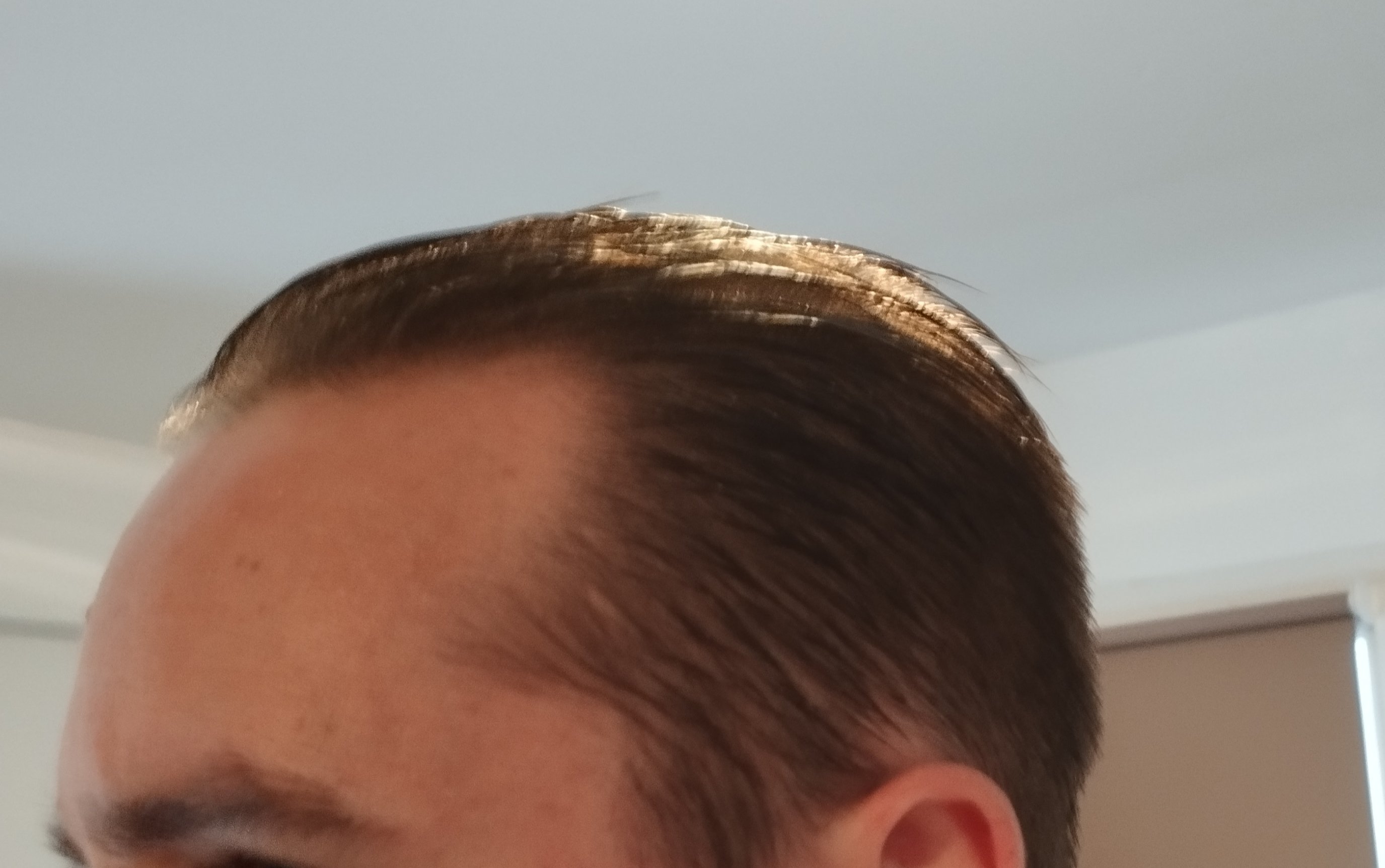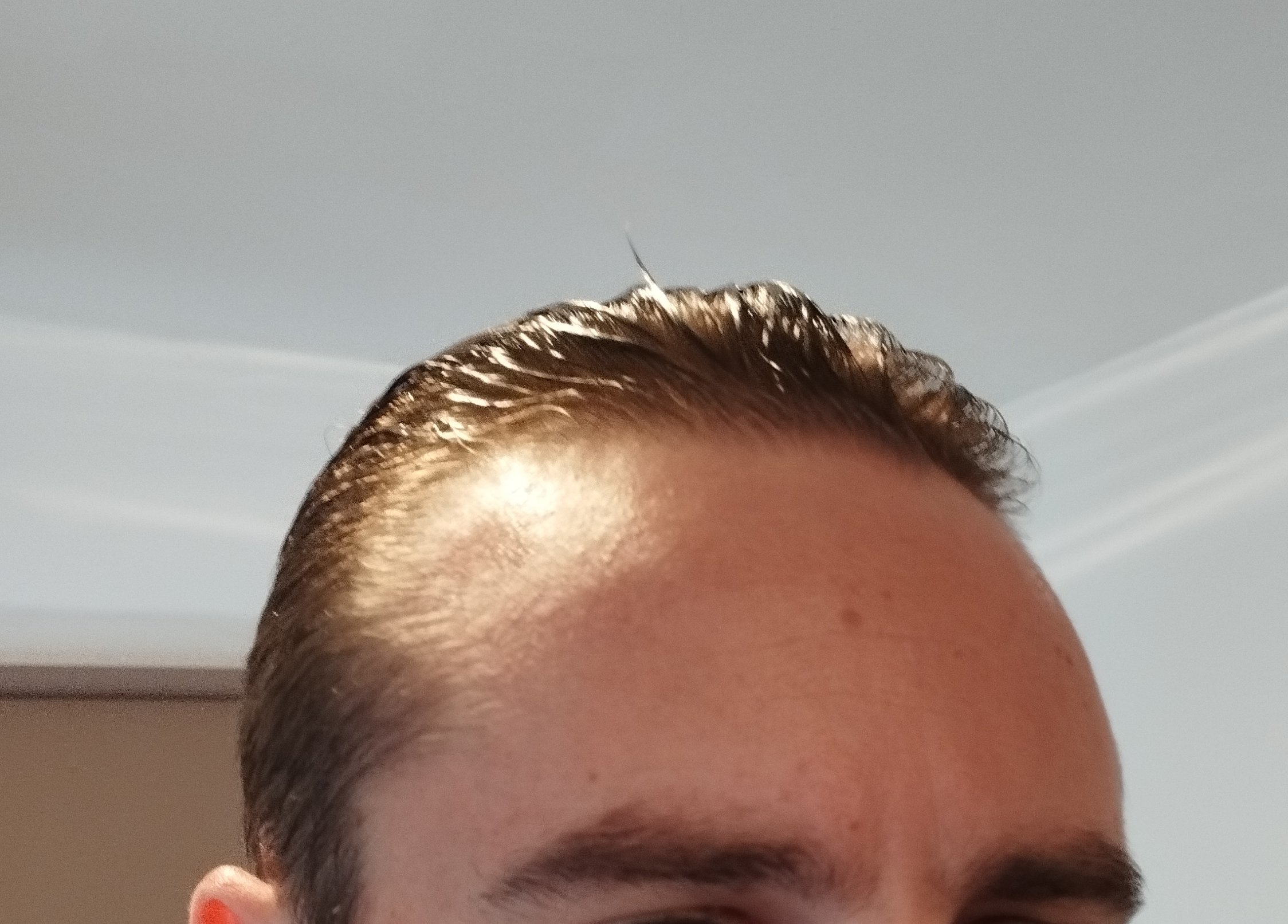 J'ai pris des photos de mes cheveux coiffés en arrière pour vous montrer (ligne frontale qui a reculé, golfs qui se sont creusés) :