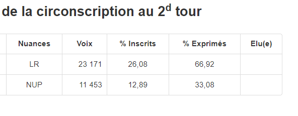 Le 19 juin 2022 à 20:26:03 : https://twitter.com/2022Elections/status/1538588621082464257 Bonne nouvelle aussi. Le boulanger gauchiste battu.