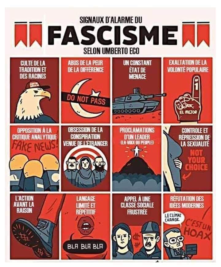 tout le monde le sait Y a aucun consensus sur ce qu'est clairement le fascisme, mais si on se base sur la définition de eco, à savoir les 12 points de manière très imagés