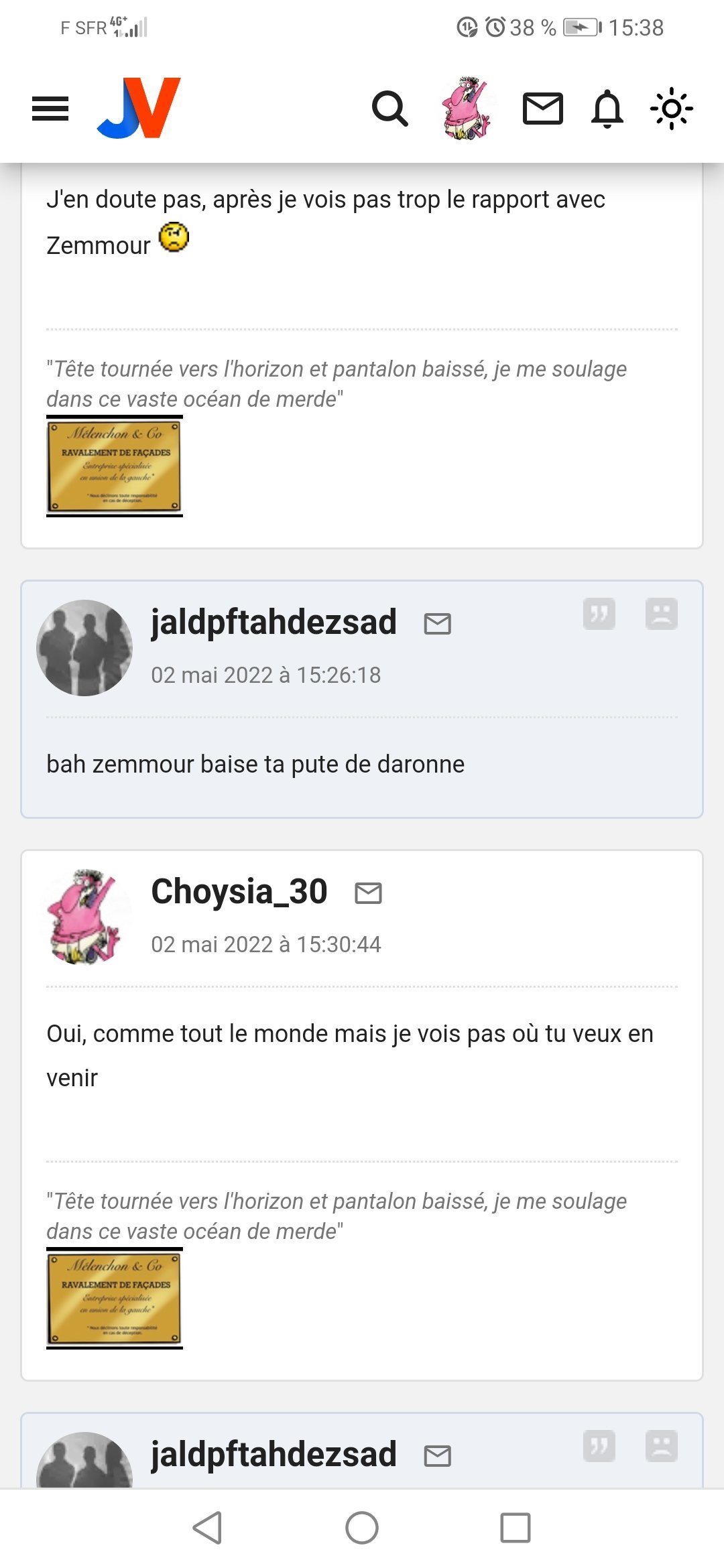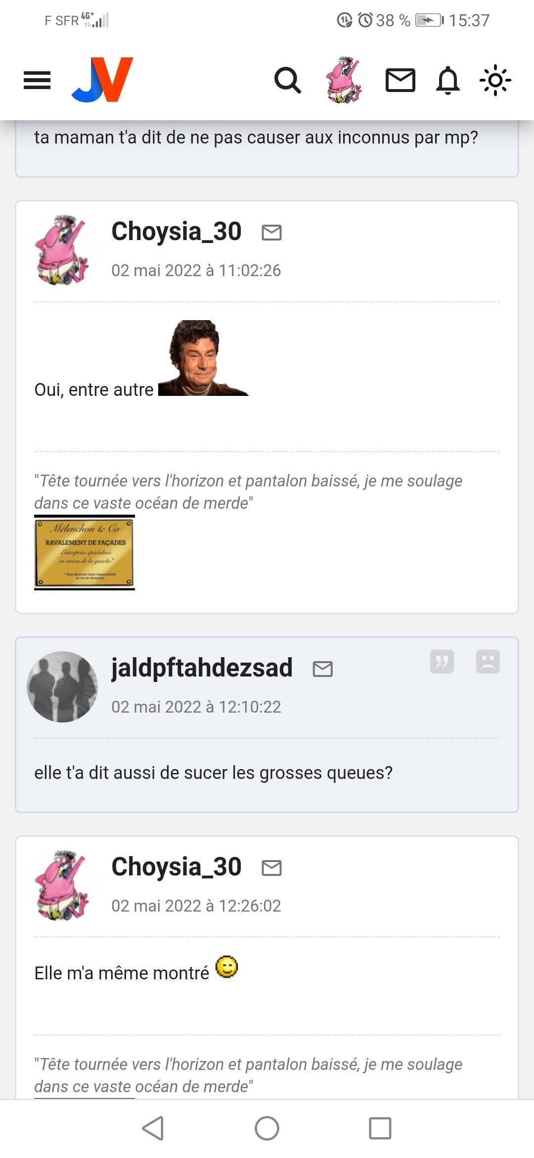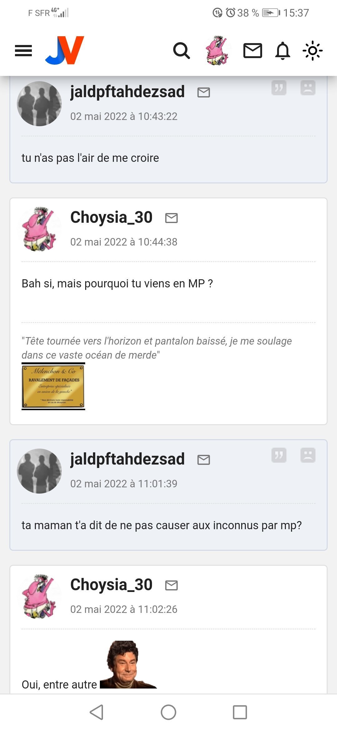 Pour la deuxieme fois en deux jours j'ai dé BL l'autre pendant 30 secondes et je le vois à nouveau spammer pour Melenchon, Choysia et Ozym vous me croyez maintenant quand je dis que c'est tres certainement s****r ?![]()