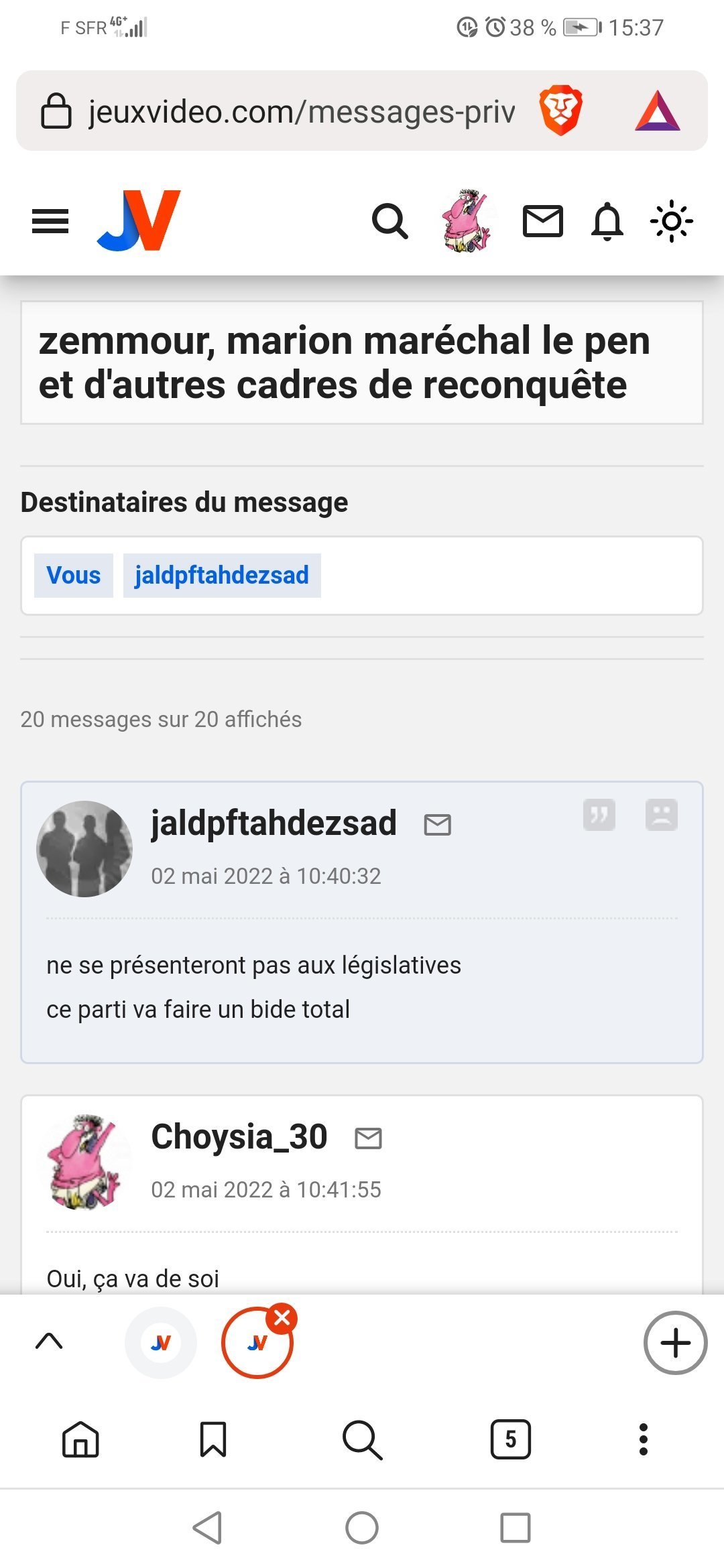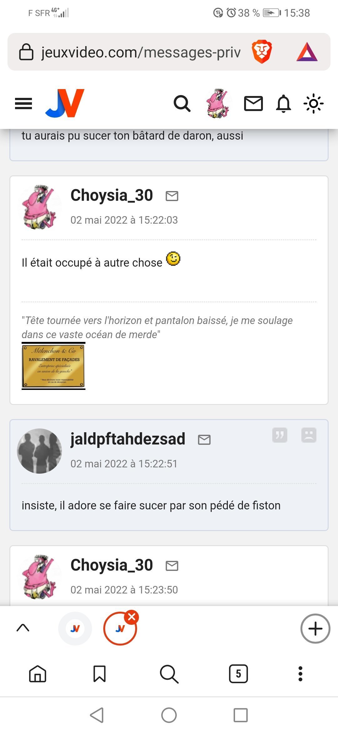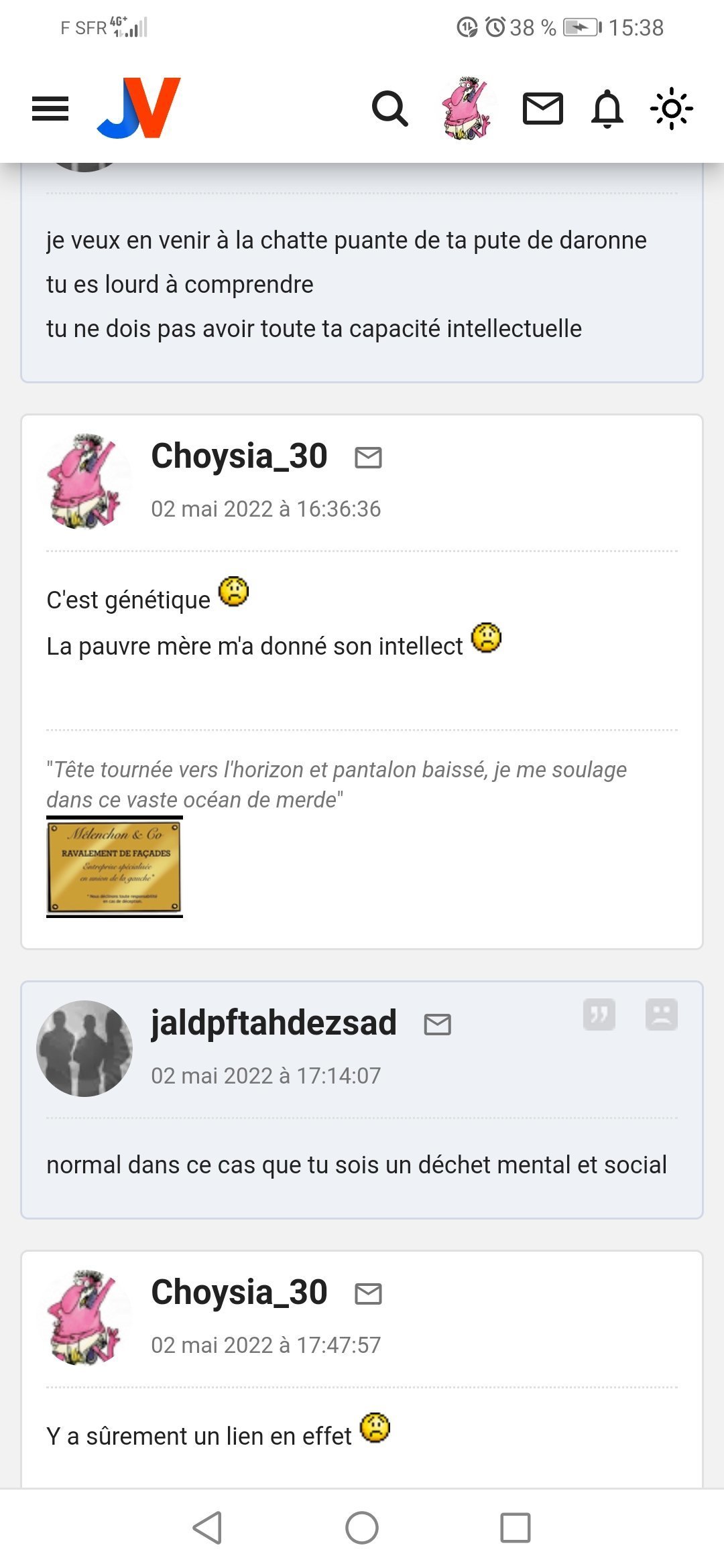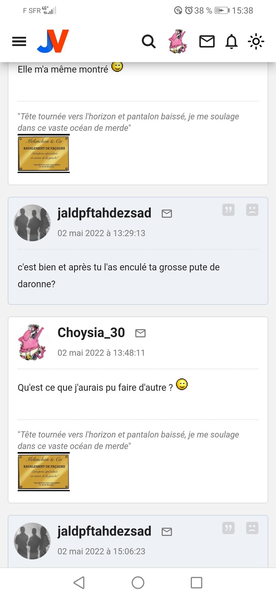 Pour la deuxieme fois en deux jours j'ai dé BL l'autre pendant 30 secondes et je le vois à nouveau spammer pour Melenchon, Choysia et Ozym vous me croyez maintenant quand je dis que c'est tres certainement s****r ?![]()