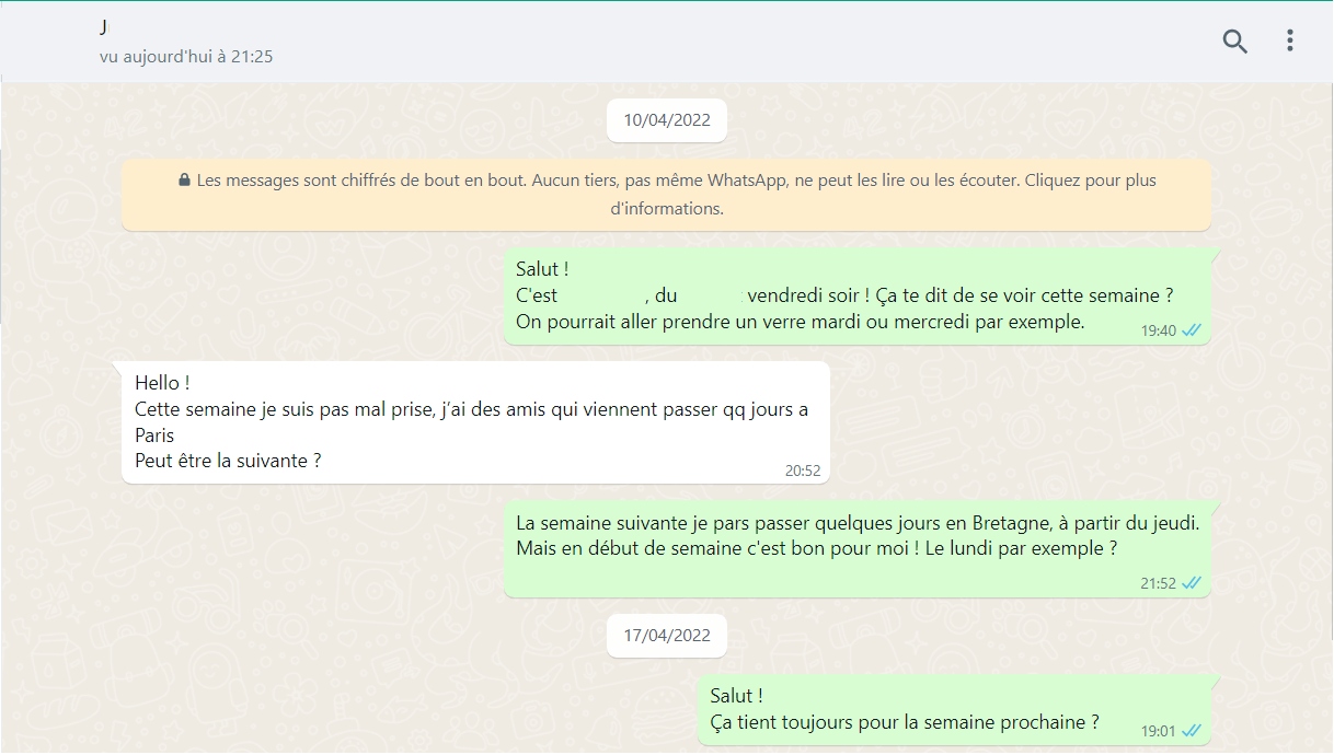 Tu veux vérifier ? Dis que t'es finalement libre Jeudi/Vendredi et tu verras sa réponse