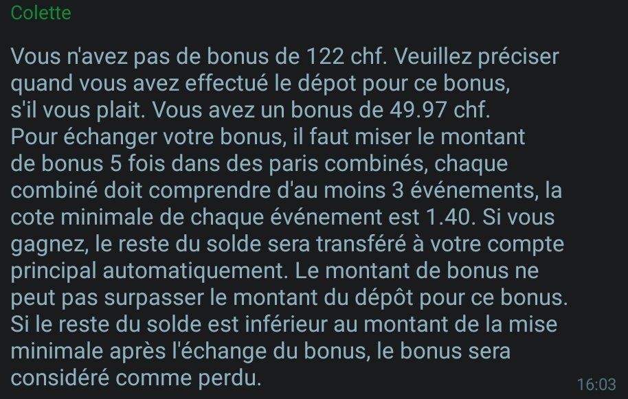 Salut les kheys je viens de me créer un compte chez 22bet où il y a un bonus de 122 euros et je ne l'ai pas reçu j'ai donc j'ai contactée le service client et il mon dit ça.