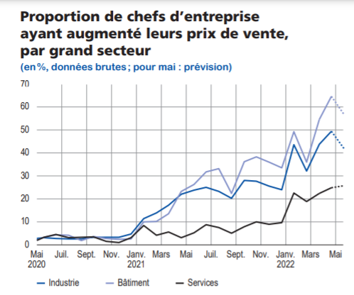 pensent augmenter leurs prix de vente le mois prochain), l’industrie (42%) et, à un moindre de degré, les services (26%).