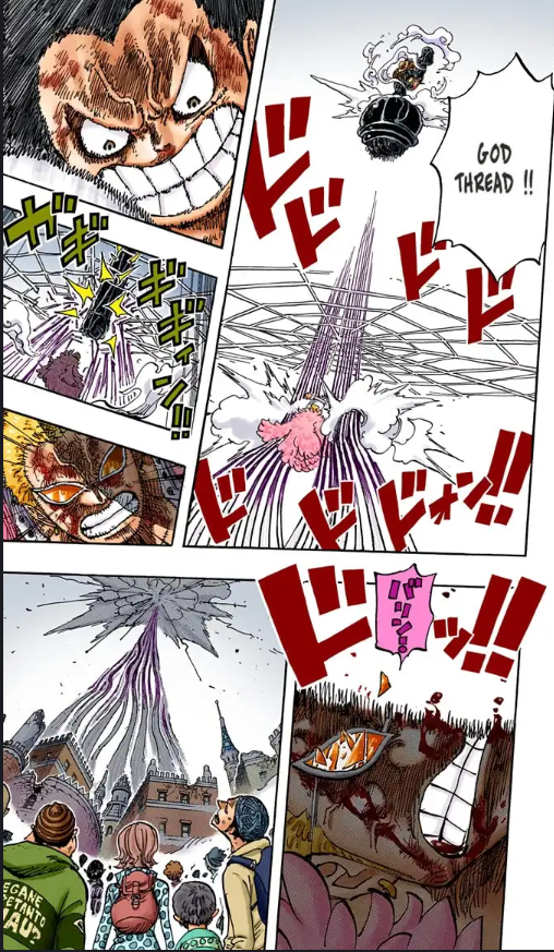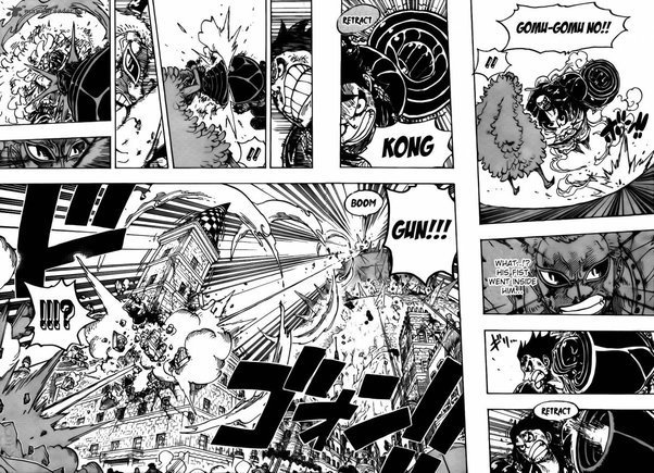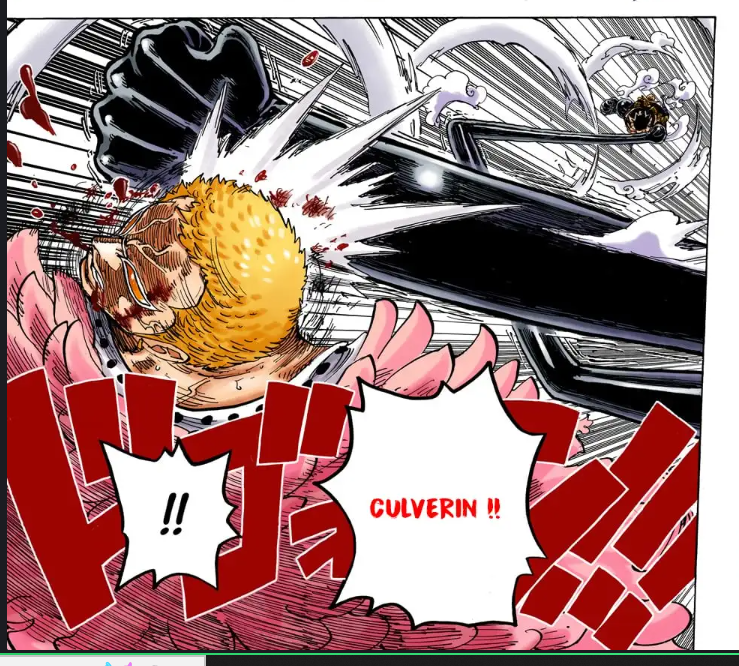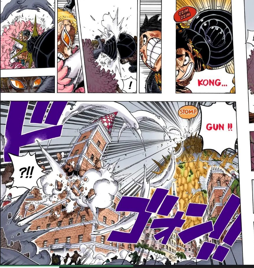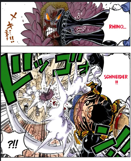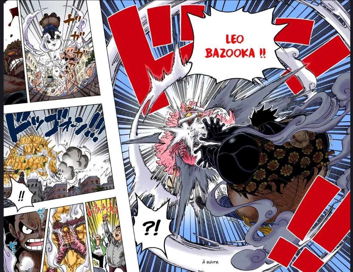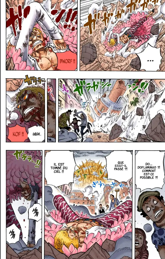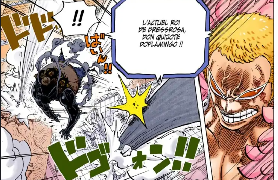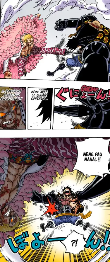 Et après Luffy s'épuise, le dernier round en Gear 4 c'est Luffy qui le OS, dans l'anime ils ont rajouté un clash avec l'attaque de Dofla, mais c'est totalement absent du manga.