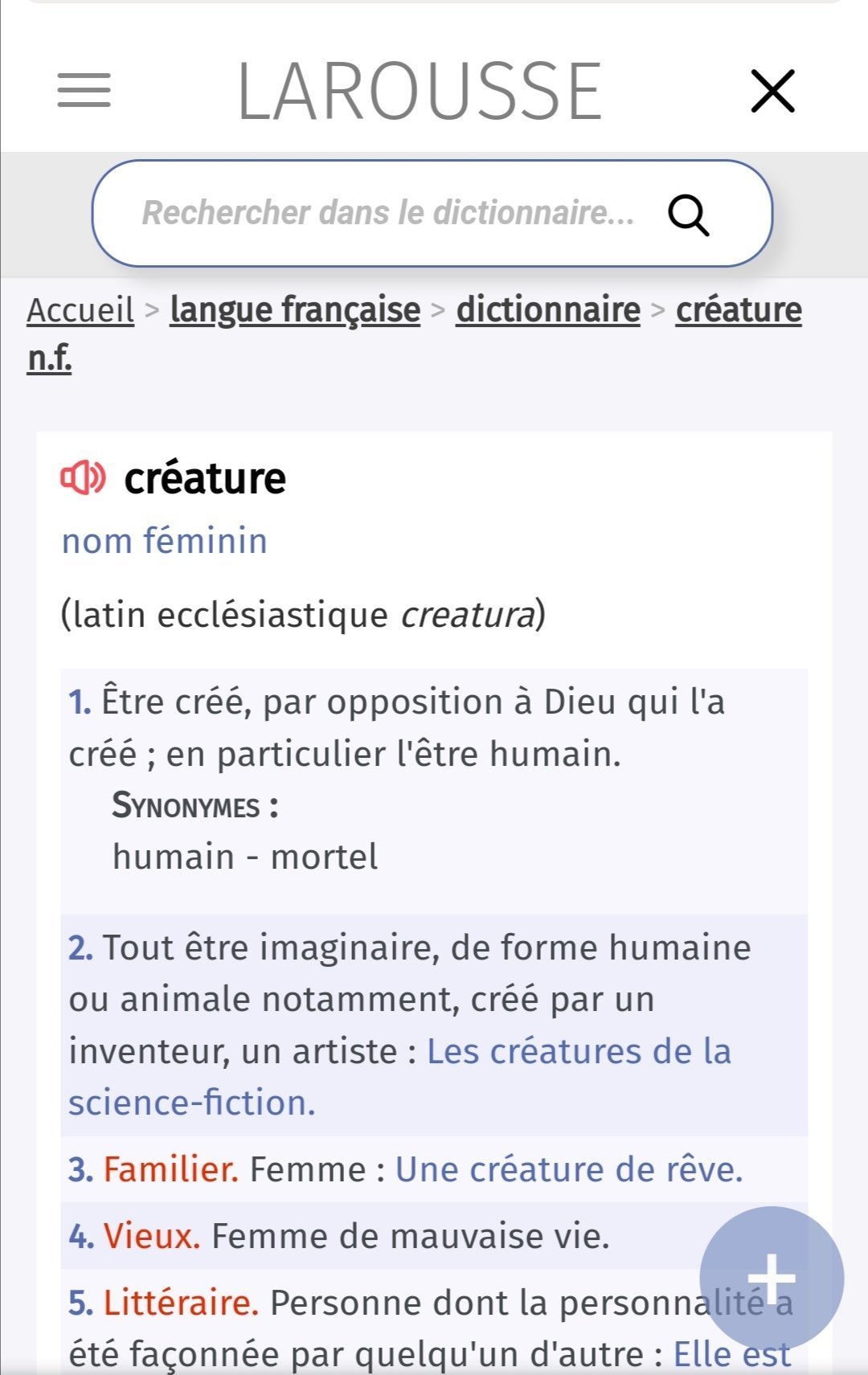 Encore une fois, ça n'exclut en rien les hommes."Tout être imaginaire, de forme humaine ou animale notamment, créé par un inventeur, un artiste : Les créatures de la science-fiction."