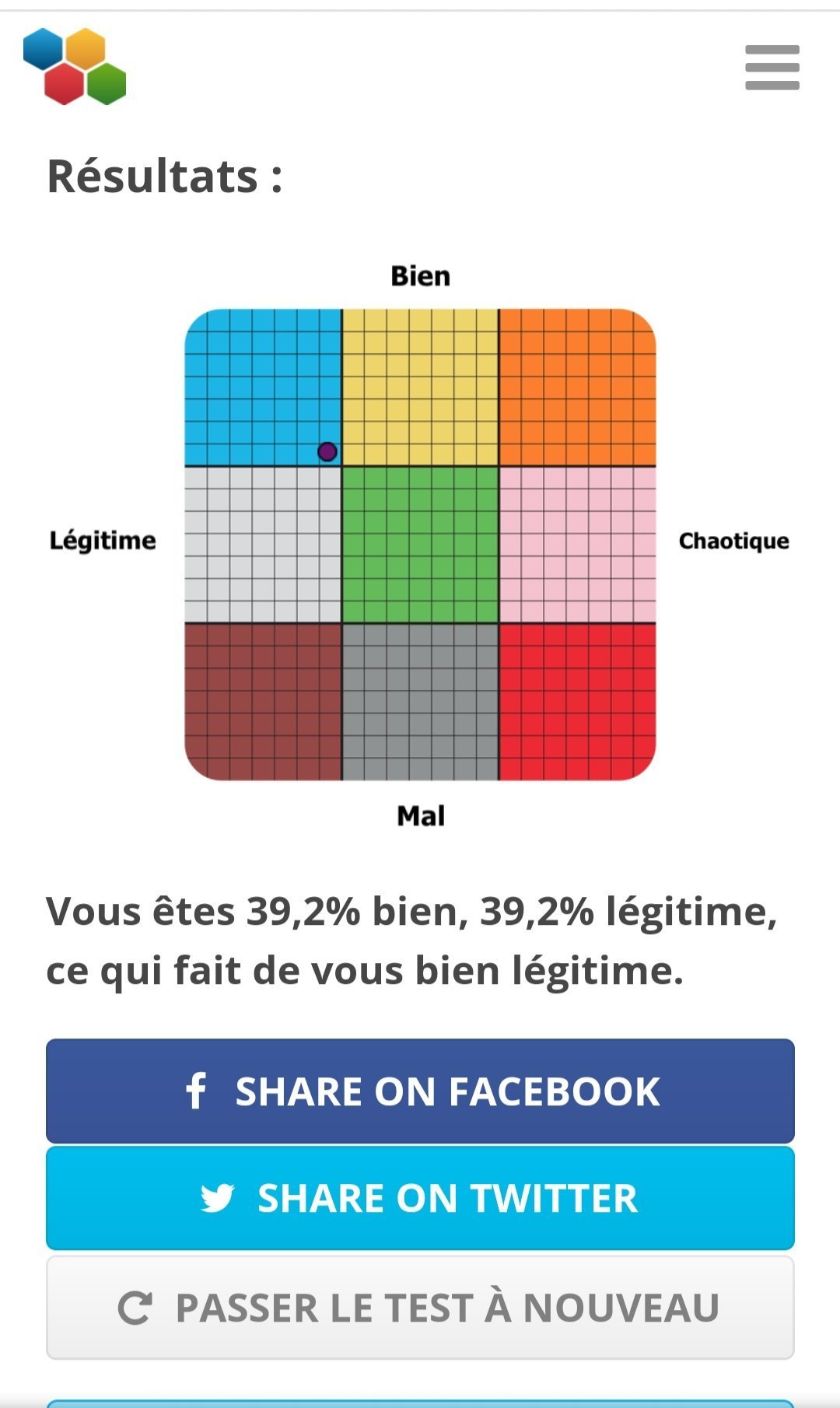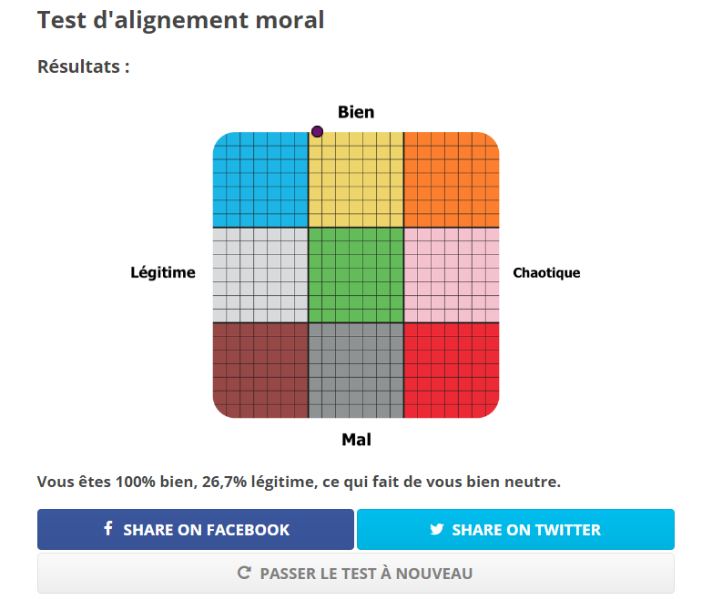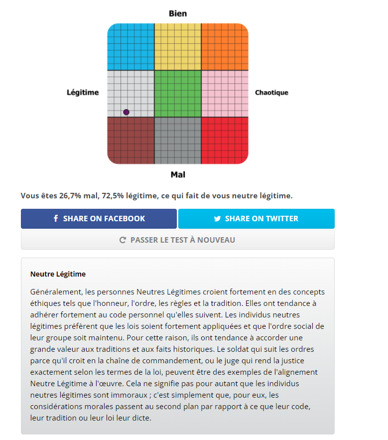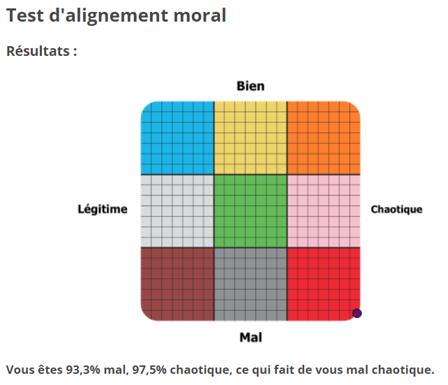Vous êtes 26,7% bien, à égalité entre le chaotique et le légitime., ce qui fait de vous véritablement neutre.