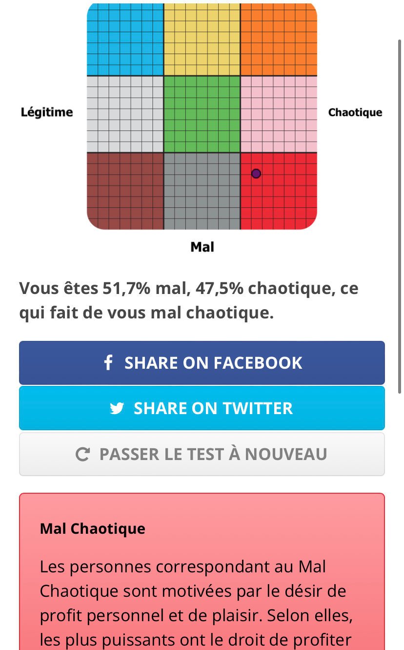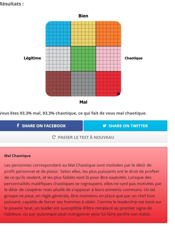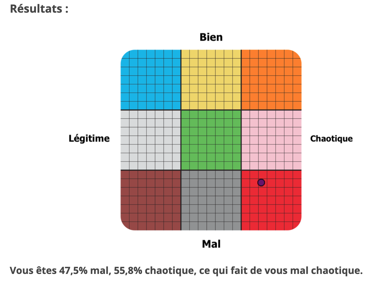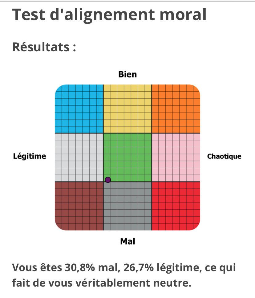 Vous êtes 14,2% mal, 64,2% légitime, ce qui fait de vous neutre légitime.