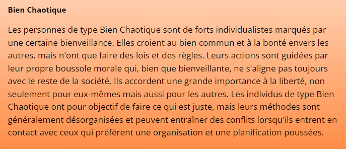 La definition est très dur "Les Neutres Chaotiques sont souvent extrêmement difficiles à vivre", je suis vraiment simple à vivre pourtant je me dispute rarement avec les gens