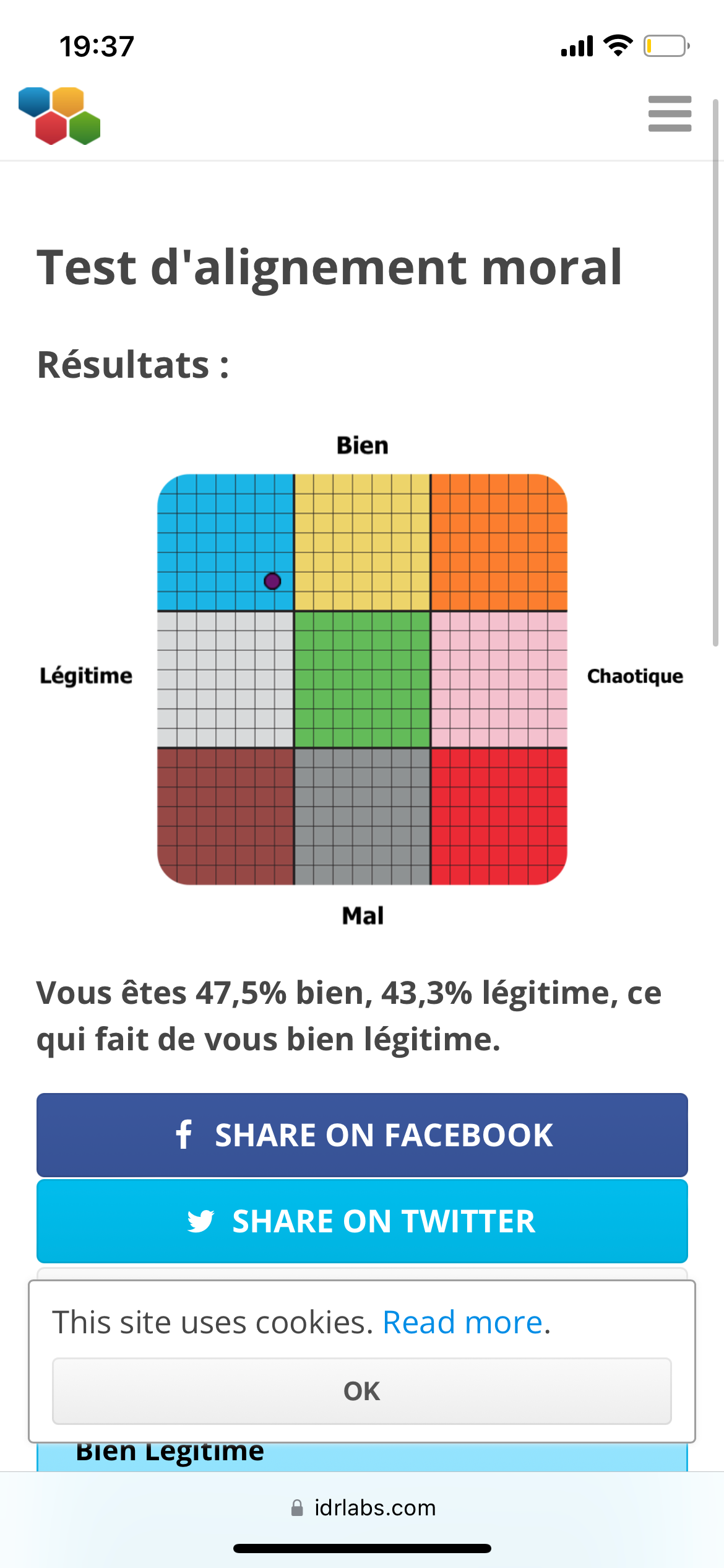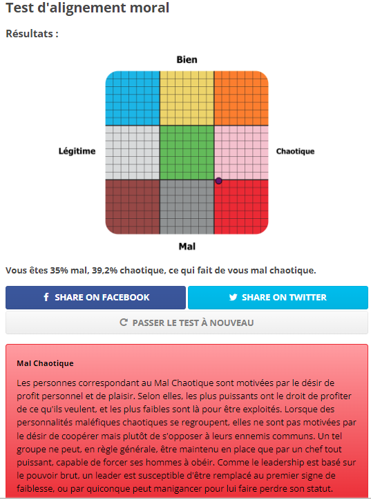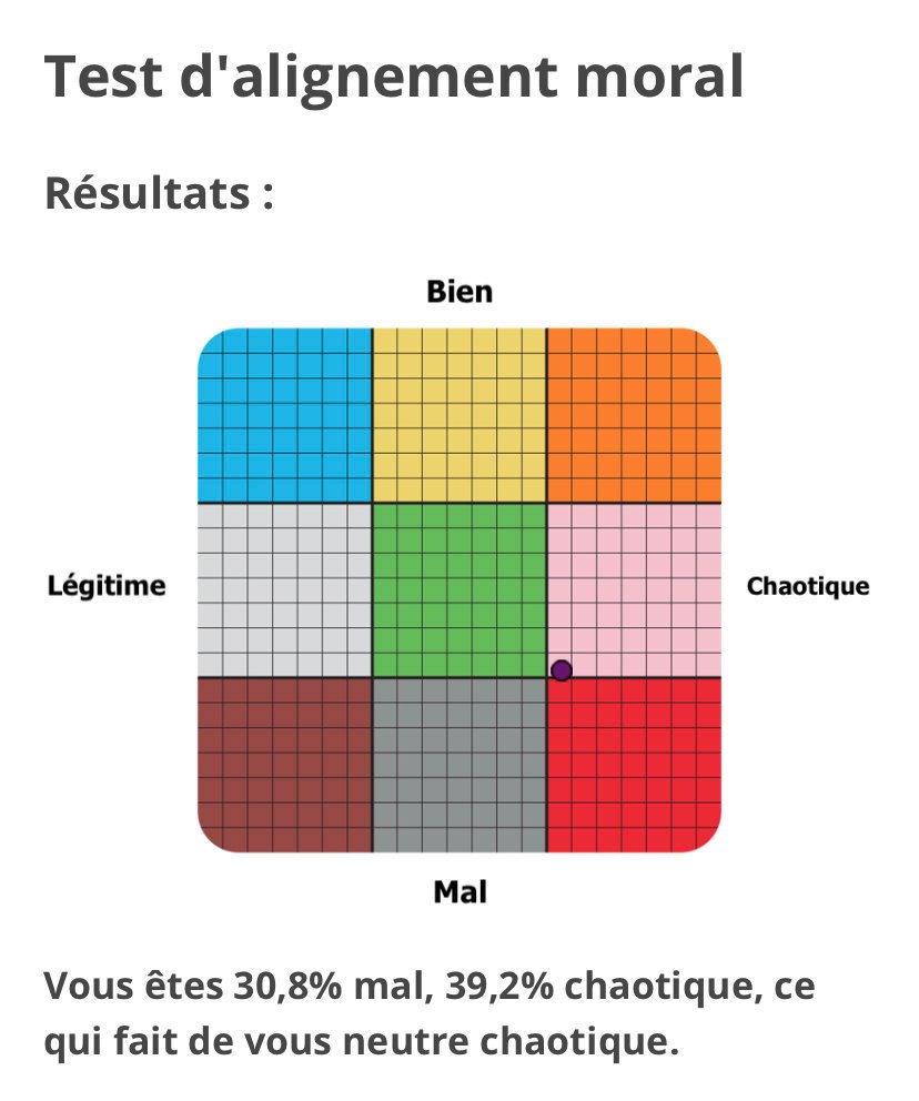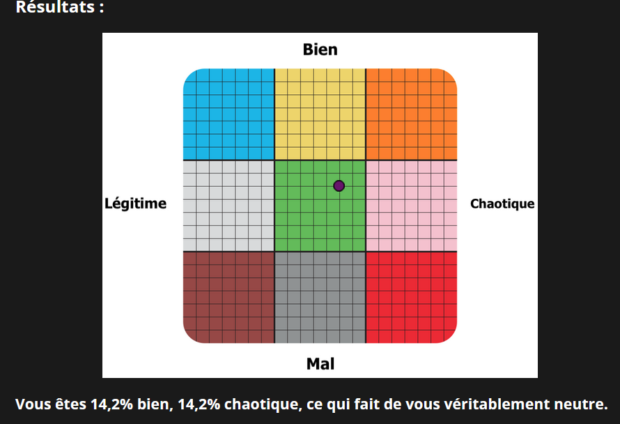 Vous êtes 18,3% mal, 51,7% chaotique, ce qui fait de vous neutre chaotique.