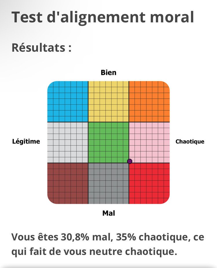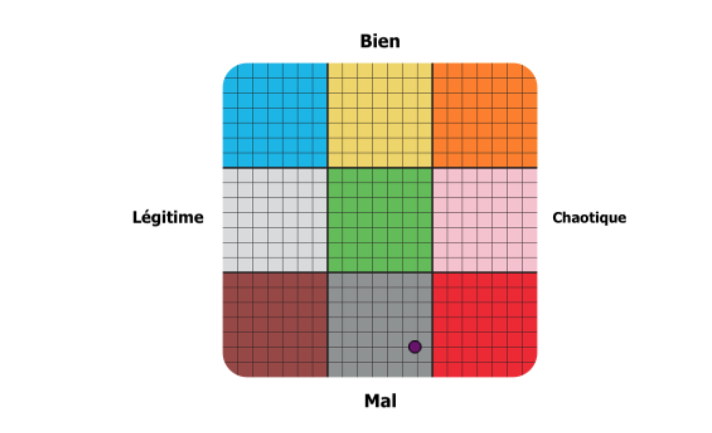 Je suis Neutre LégitimeGénéralement, les personnes Neutres Légitimes croient fortement en des concepts éthiques tels que l'honneur, l'ordre, les règles et la tradition. Elles ont tendance à adhérer fortement au code personnel qu'elles suivent. Les individus neutres légitimes préfèrent que les lois soient fortement appliquées et que l'ordre social de leur groupe soit maintenu. Pour cette raison, ils ont tendance à accorder une grande valeur aux traditions et aux faits historiques. Le soldat qui suit les ordres parce qu'il croit en la chaîne de commandement, ou le juge qui rend la justice exactement selon les termes de la loi, peuvent être des exemples de l'alignement Neutre Légitime à l'œuvre. Cela ne signifie pas pour autant que les individus neutres légitimes sont immoraux ; c'est simplement que, pour eux, les considérations morales passent au second plan par rapport à ce que leur code, leur tradition ou leur loi leur dicte.