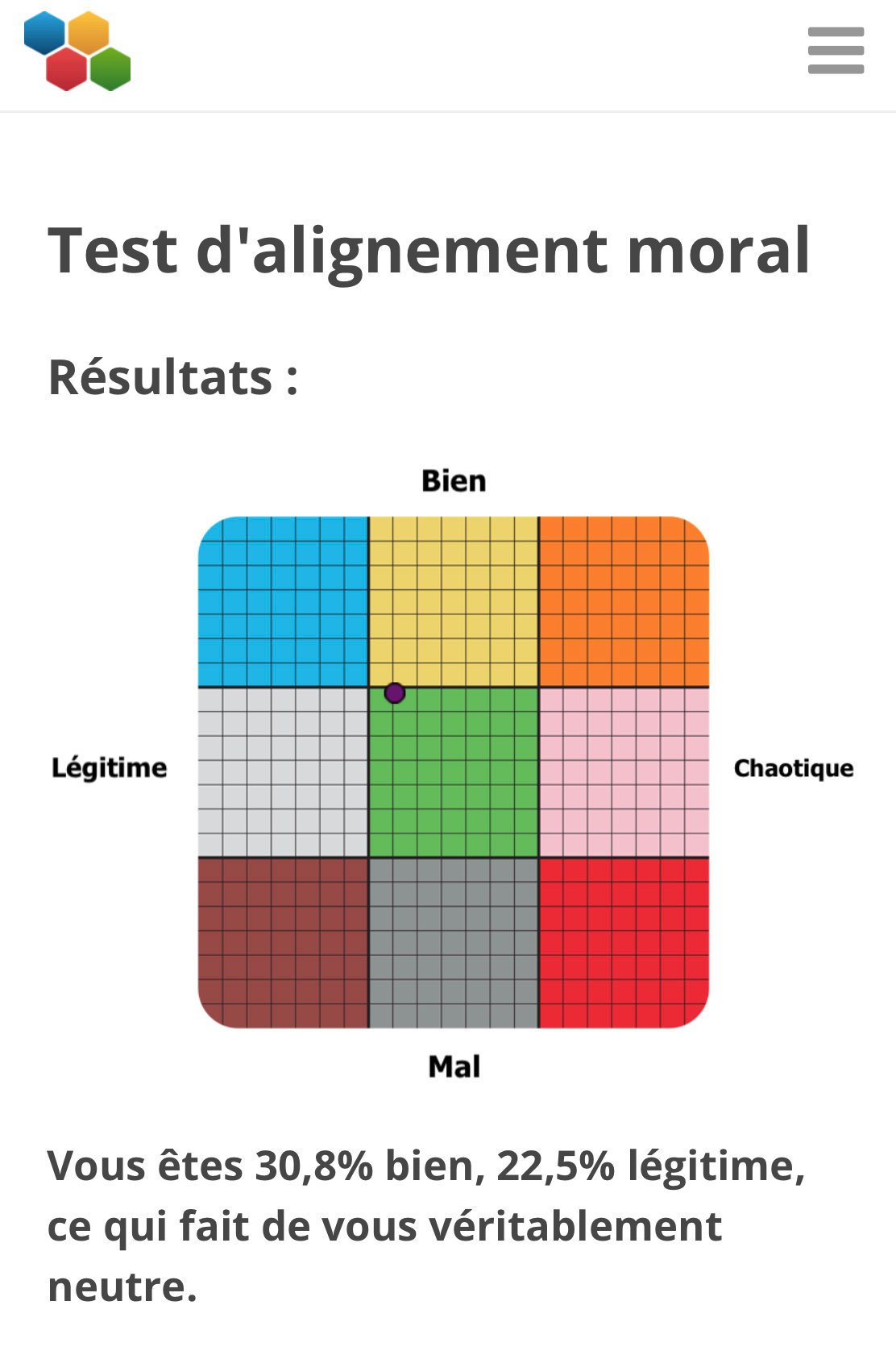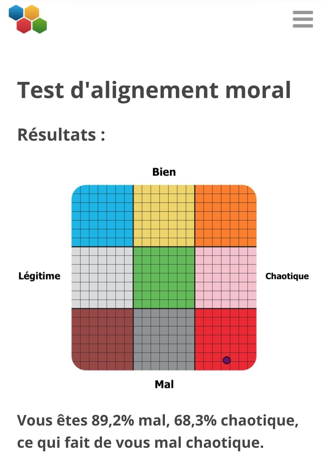 De plus ce test ne calcule pas si t'es une bonne personne ou non c'est beaucoup trop imprécis pour ça et une bonne personne peut se comporter en mauvais durant certaines périodes de sa vie et ce qu'il vit etc