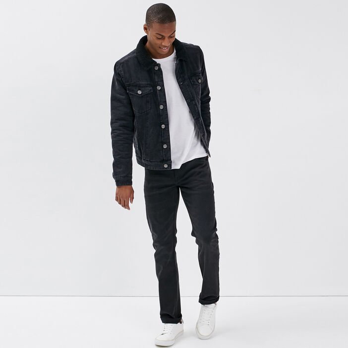 jai un jean lewis gris, une veste légére en jean grise ouverte avec un t-shirt blanc Kaporal en dessous, des chaussures noires intersport
