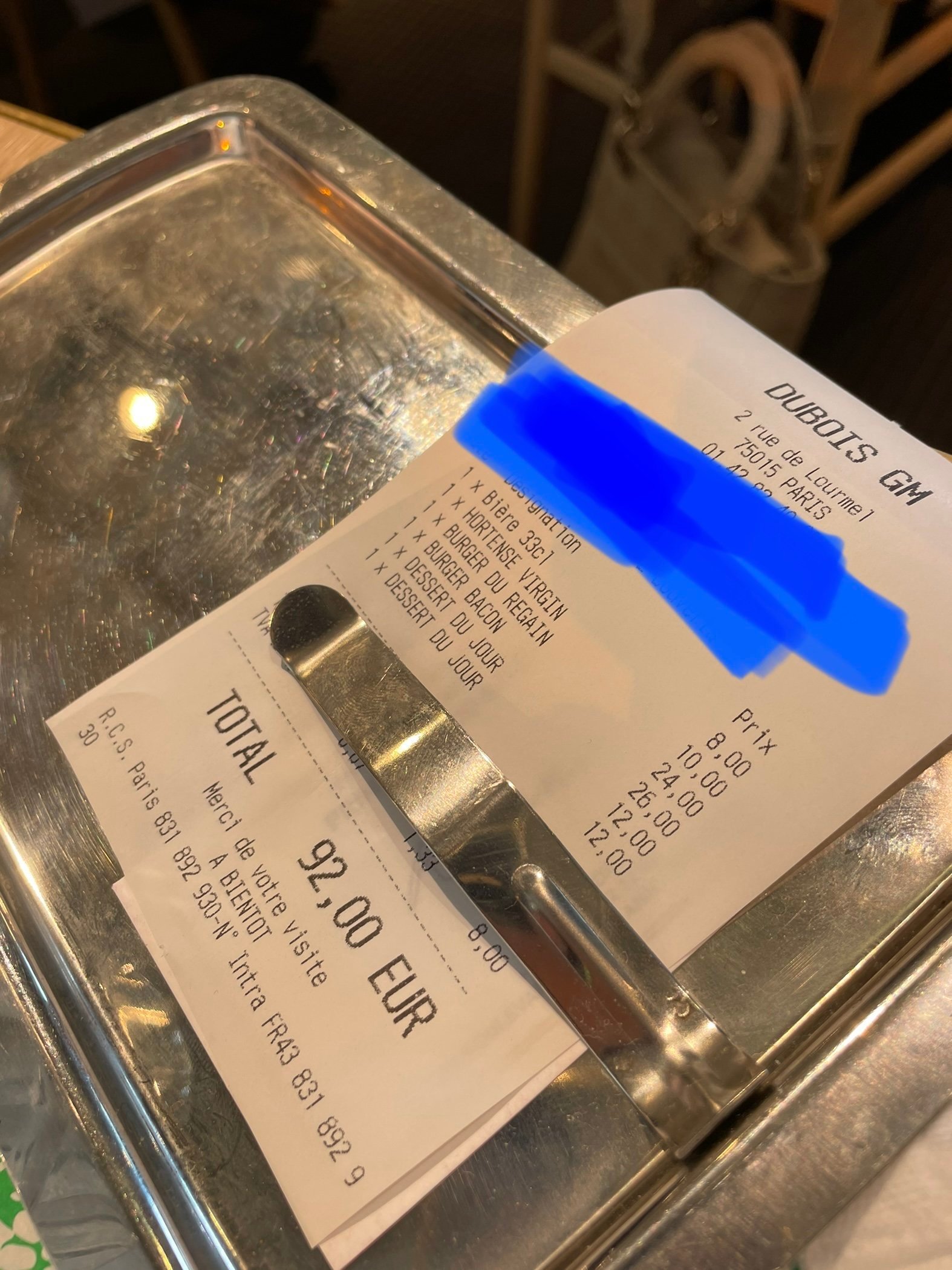 2 burgers, 2 boissons, 2 desserts = 92€.