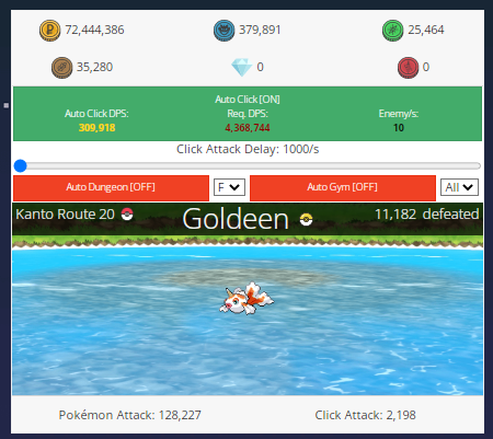 Vous en êtes où vous ?Kanto, 20h de jeu, 120,000 d'attaque et 2,000 en click. Me manque 20 pokémons pour passer à la suite