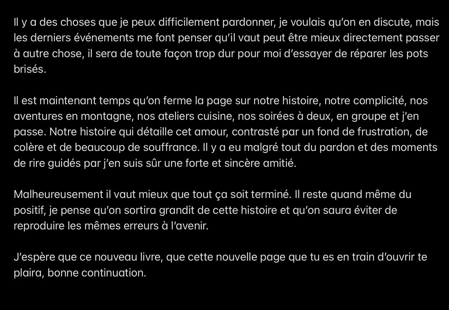 Voilà, je dois encore lui rendre quelques petites affaires, je pense les mettre directement dans sa boîte au lettre. Dedans il y a un livre que j’ai déjà en double et que je comptais lui offrir vu que c’était son anniv il y a quelques jours. J’ai l’intention d’y laisser ce mot dedans :