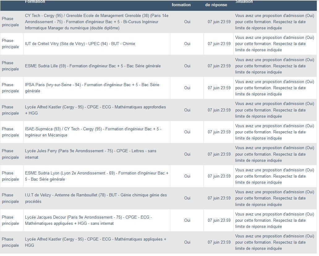 Je suis en liste d'attente dans 29 voeux, je peux vous les joindres aussi si vous voulez. A savoir que je n'ai pas demandé de prépa purement scientifique (psci, mpsi etc..)