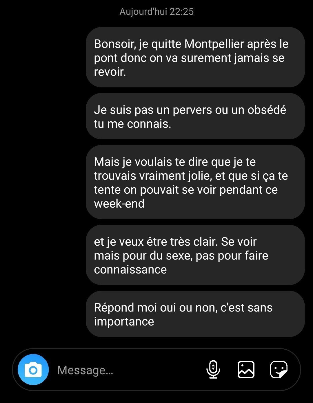 Donc vaut mieux couper court dès le début si t'es pas intéressé. L'op aurait pu être honnête et plus libéré en lui disant "T'es partante pour qu'on se voit le weekend ? Tu sais je vais partir dans deux jours et on risque de plus jamais se voir, je trouverai ça cool qu'on se voit une dernière fois" c'est beaucoup mieux.