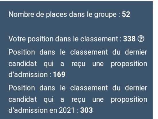 Le 02 juin 2022 à 20:30:08 :Le 02 juin 2022 à 20:29:35 :Le 02 juin 2022 à 20:28:13 :Bah c'est chaud, mais faisable. Du moins si tu es pris, tu fais partie des tout derniers pris Bonne chance khey, on est dans le meme bateau Merci khey. Refuser dans 20 vœux avec 13-14 de moyenne en première/terminale Tu as visé trop haut Vive la franced