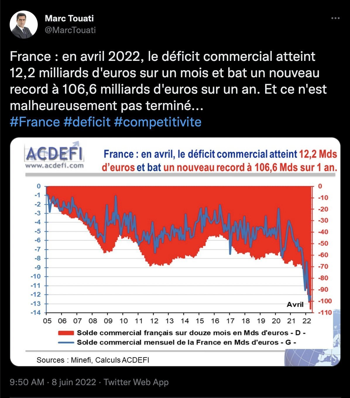 https://twitter.com/MarcTouati/status/1534442790305898496?ref_src=twsrc%5Etfw%7Ctwcamp%5Etweetembed%7Ctwterm%5E1534442790305898496%7Ctwgr%5E%7Ctwcon%5Es1_&ref_url=https%3A%2F%2Fdemocratie-participative.world%2Fles-choses-vont-mieux-106-milliards-de-deficit-commercial-sans-plomb-a-22-euros-et-bientot-le-cheque-a-150-euros-pour-se-payer-des-pates%2F