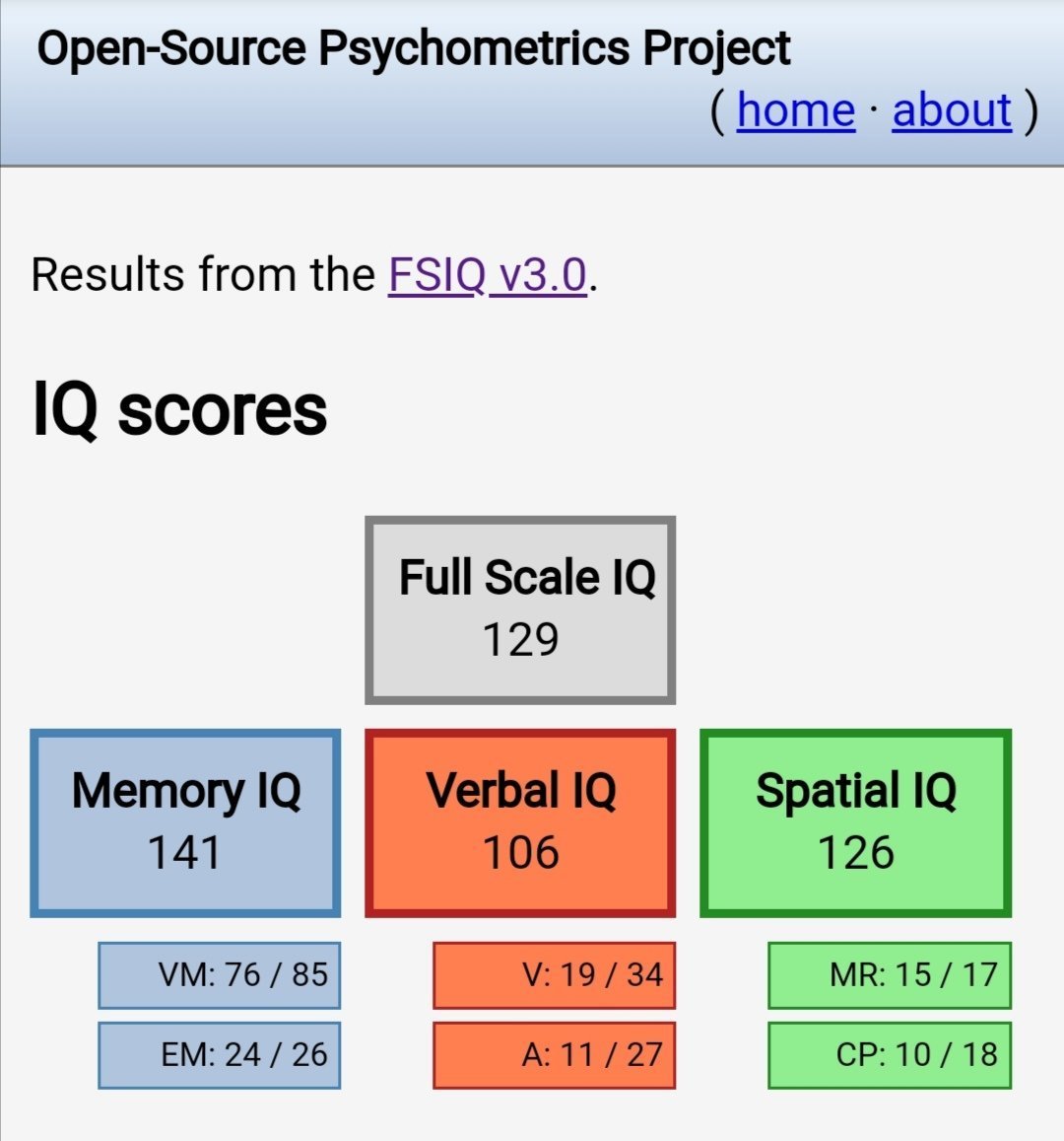 J'ai décidé de repasser le test car je suis con apparemment et malgré avoir obtenu un plus haut score en mémoire et spatial, le score global est passé de 138 à 136 à cause d'une perte de 7 points dans la catégorie verbal (le premier test pour comparé:)