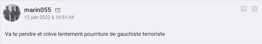 Le 12 juin 2022 à 17:01:21 : Le marin c'est un gros malade mental, c'est pas la première fois qu'il te balance des trucs du genre, mais toujours en MP parce qu'évidemment, y'a pas plus lâche que ce genre de type