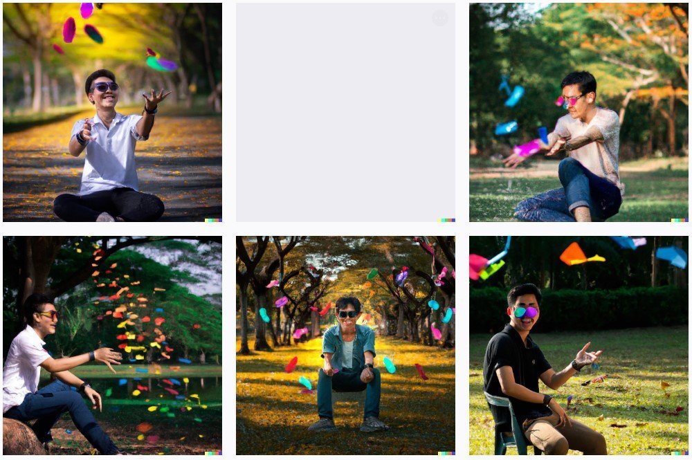 An seated asian man throwing colored glasses at friends, in a park, photography
