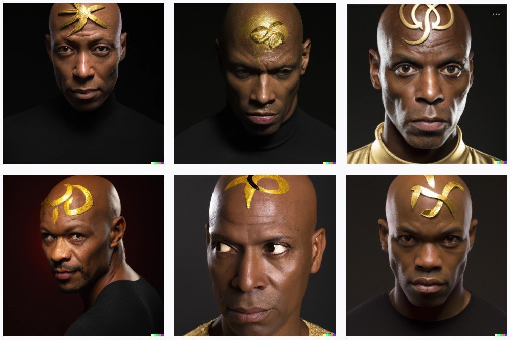 Bald Black Man with on the third eye position a gold patch with the symbol of apophis