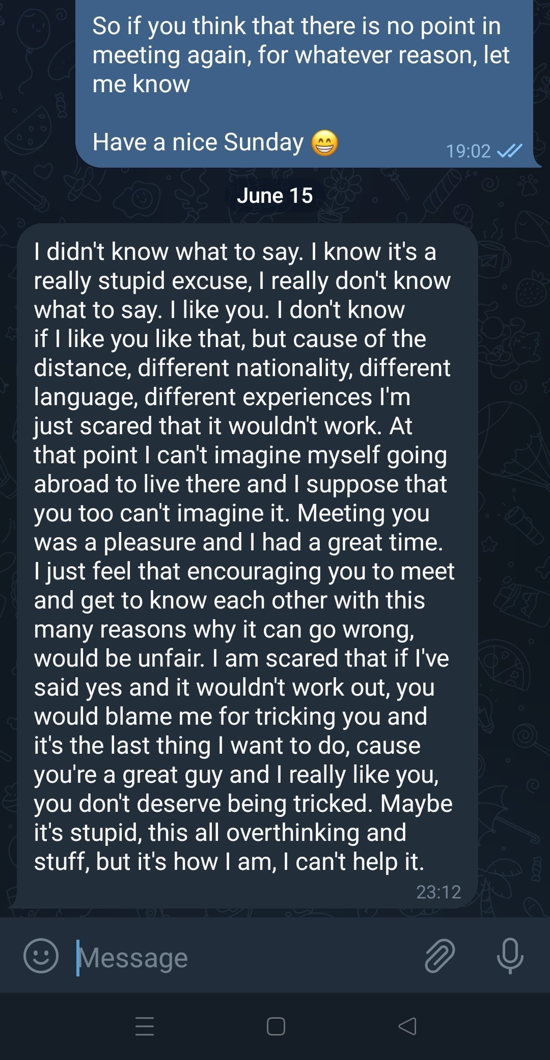 En soit y'a pas grand chose qui dit qu'elle ne veut rien tenter avec toi. Mais tu es tomber sur une fille avec un cerveau et de l'empathie. Rien que pour ça, quelque soit la réponse soit content.