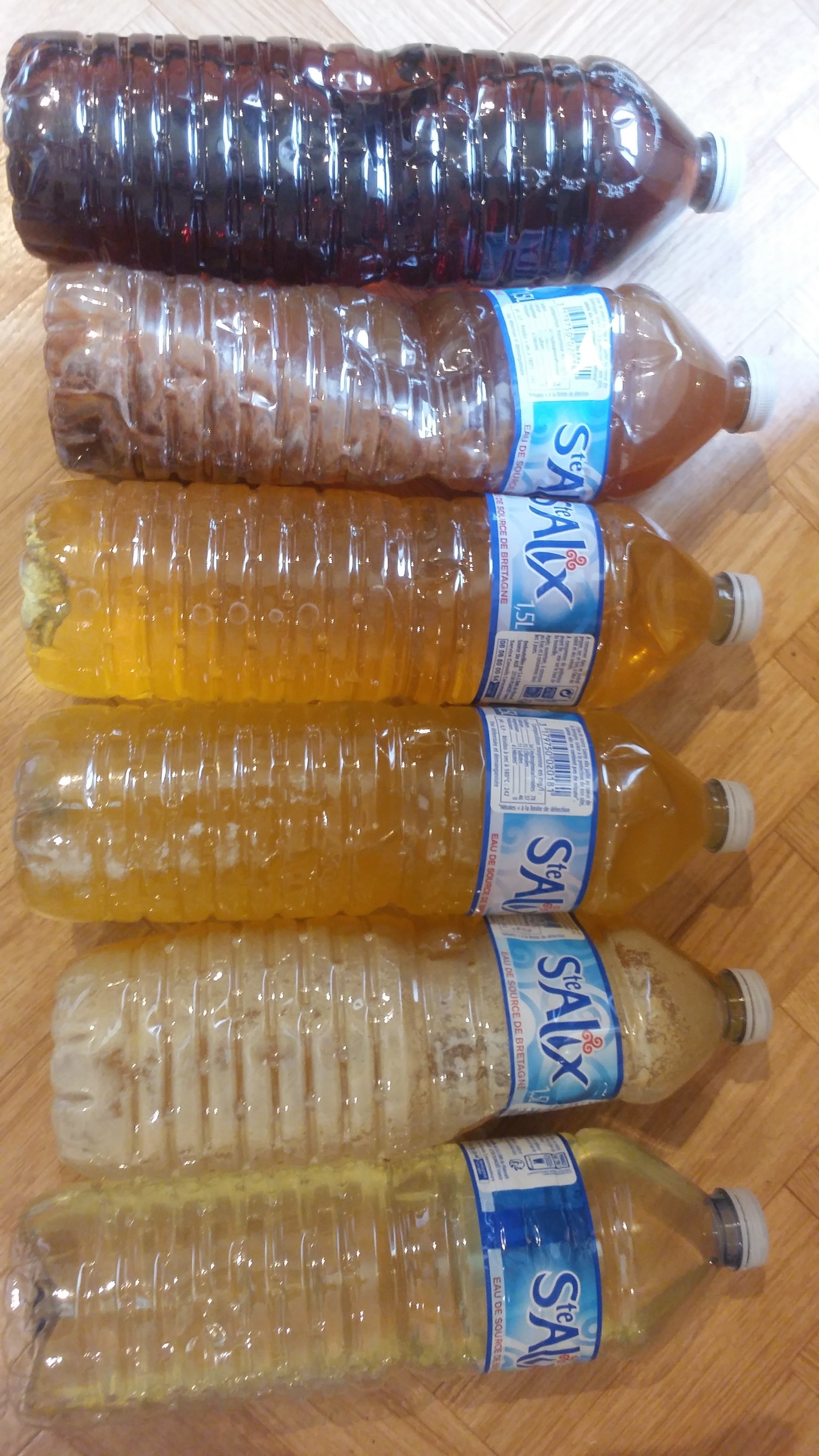 Je suis fier de vous présentez mes magnifiques bouteilles de pisse, de la plus vielle à la plus jeune en partant de la gauche. Celle qui est noir est vielle d'un an, j'ai chié dans l'avant dernière à gauche mais je le fais plus c'est une énorme galère, il faut forcer la merde avec des mouchoirs et ça gicle et tout.