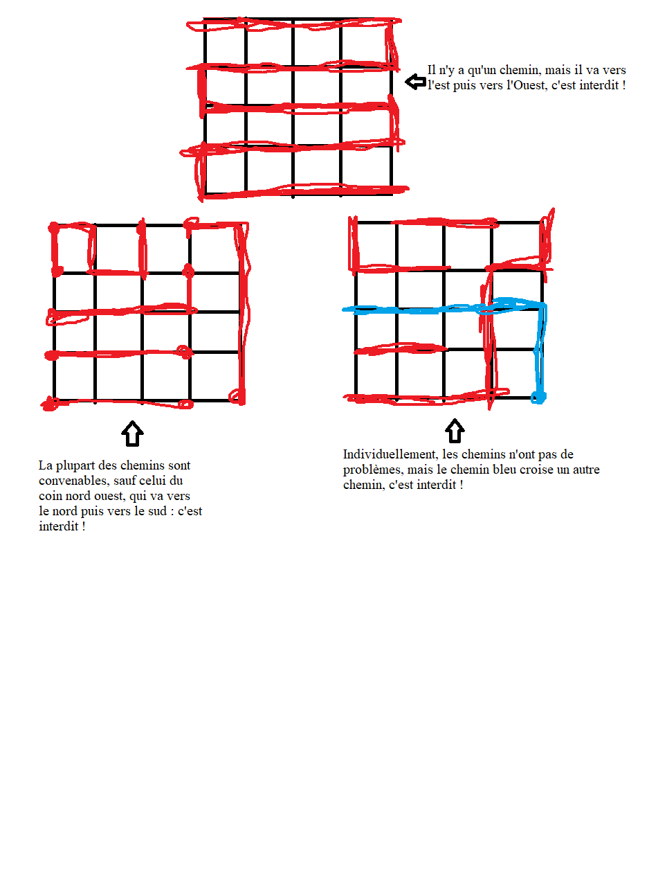 -Si un de vos chemins commence à aller dans une direction (donc nord, sud, est ou ouest) alors il est interdit que ce chemin aille par la suite dans la direction opposée.