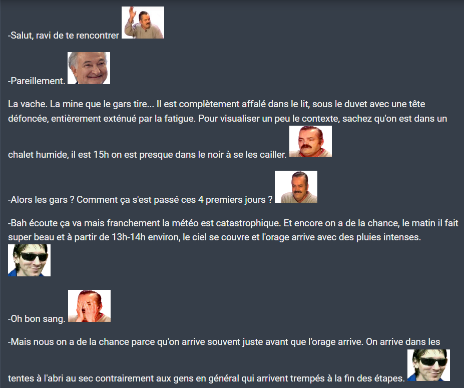 -On est tous revenu avec les plateaux dans les tentes, on mangeait dans le froid, dans le noir, avec les lampes frontales bon dieu... Et en plus c'était encore des pates fades, sans assaisonnement, sans sels sans poivre, sans sauces.