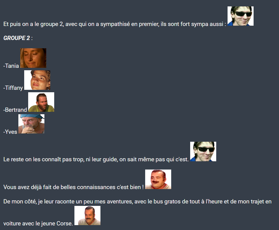 De mon côté, je leur raconte un peu mes aventures, avec le bus gratos de tout à l'heure et de mon trajet en voiture avec le jeune Corse.