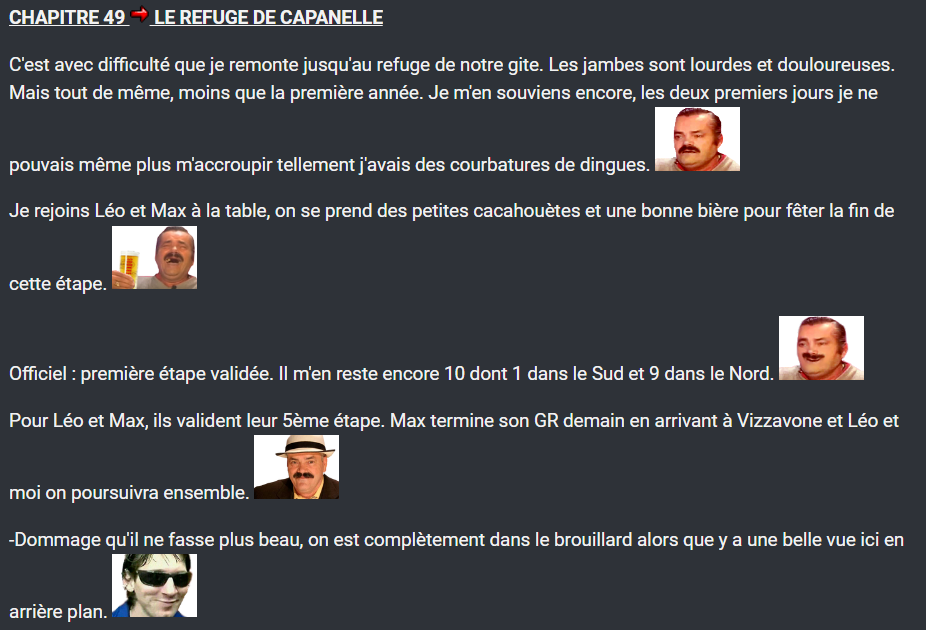-Ah oui oui il veut continuer mais j'espère qu'il va arrêter à Vizzavone. Je veux pas qu'il s'engage sur le Nord parce qu'on va perdre un de ses genoux dans la montagne, c'est certain. Il finira à l'hélico.