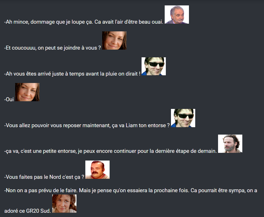-Ah oui c'est vrai c'est votre dernier jour. Vous voulez qu'on partage la route ensemble ? Jusqu'à Vizzavone ?