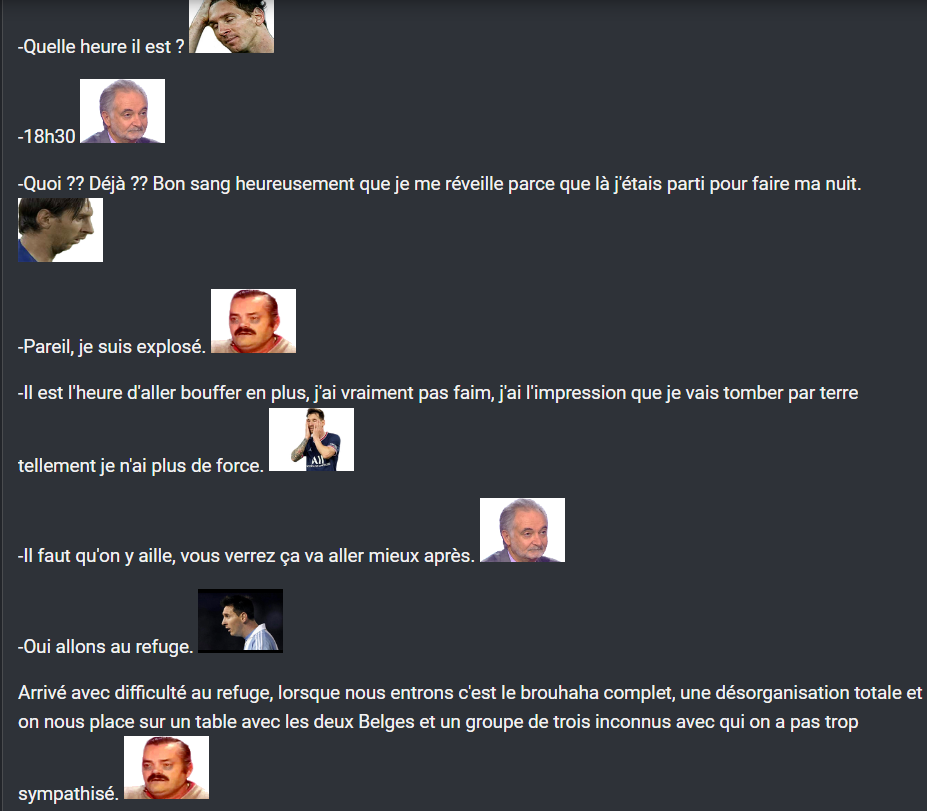 -Ok plus tard alors. J'essai de dire pareil à mon groupe et de pas abuser de la bière parce que mine de rien ça déshydrate beaucoup et pour attaquer le Nord, il vaut mieux éviter.