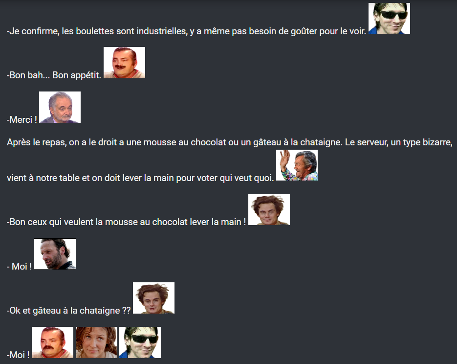 Après le repas, on a le droit a une mousse au chocolat ou un gâteau à la chataigne. Le serveur, un type bizarre, vient à notre table et on doit lever la main pour voter qui veut quoi.
